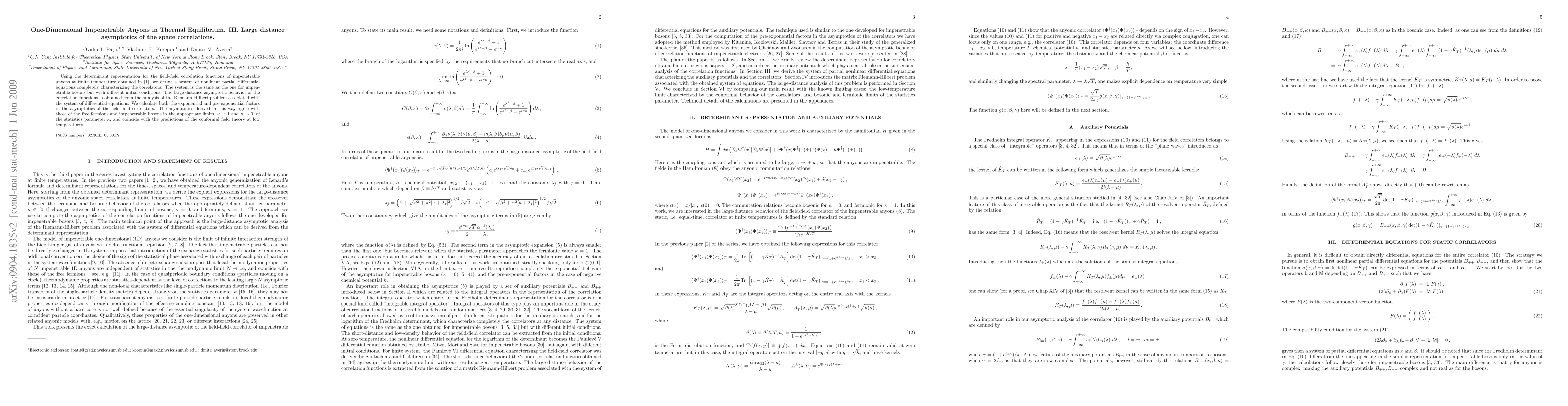 This paper derives a system of nonlinear partial differential equations characterizing the correlation functions of impenetrable anyons at finite temperature, analogous to those for impenetrable bosons but with different initial conditions. The large-distance asymptotic behavior of these correlators is analyzed through a Riemann-Hilbert problem, yielding agreement with free fermions and impenetrable bosons in specific limits and conformal field theory predictions at low temperatures.