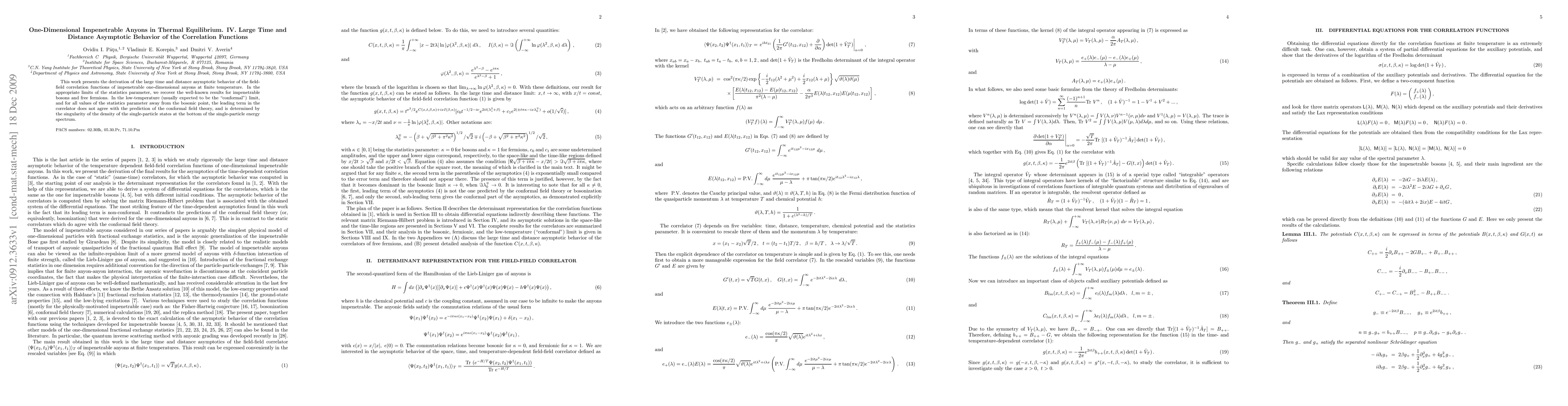 This work presents the derivation of the large time and distance asymptotic behavior of the field-field correlation functions of impenetrable one-dimensional anyons at finite temperature. In the appropriate limits of the statistics parameter, we recover the well-known results for impenetrable bosons and free fermions. In the low-temperature (usually expected to be the "conformal") limit, and for all values of the statistics parameter away from the bosonic point, the leading term in the correlator does not agree with the prediction of the conformal field theory, and is determined by the singularity of the density of the single-particle states at the bottom of the single-particle energy spectrum.