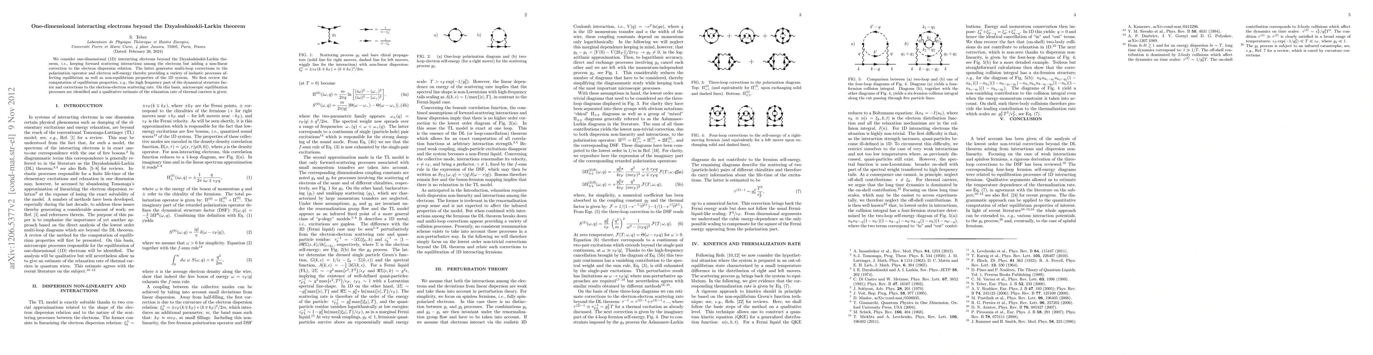 We consider one-dimensional (1D) interacting electrons beyond the Dzyaloshinskii-Larkin theorem, i.e., keeping forward scattering interactions among the electrons but adding a non-linear correction to the electron dispersion relation. The latter generates multi-loop corrections to the polarization operator and electron self-energy thereby providing a variety of inelastic processes affecting equilibrium as well as non-equilibrium properties of the 1D system. We first review the computation of equilibrium properties, e.g., the high frequency part of the dynamical structure factor and corrections to the electron-electron scattering rate. On this basis, microscopic equilibration processes are identified and a qualitative estimate of the relaxation rate of thermal carriers is given.