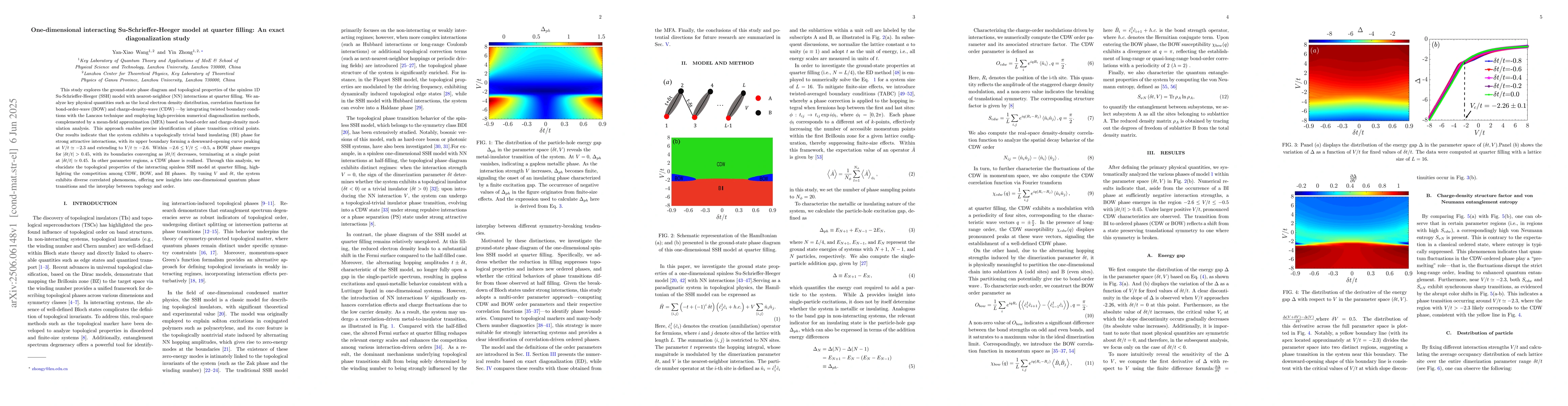 This study explores the ground-state phase diagram and topological properties of the spinless 1D Su-Schrieffer-Heeger (SSH) model with nearest-neighbor (NN) interactions at quarter filling. We analyze key physical quantities such as the local electron density distribution, correlation functions for bond-order-wave (BOW) and charge-density-wave (CDW) -- by integrating twisted boundary conditions with the Lanczos technique and employing high-precision numerical diagonalization methods, complemented by a mean-field approximation (MFA) based on bond-order and charge-density modulation analysis. This approach enables precise identification of phase transition critical points. Our results indicate that the system exhibits a topologically trivial band insulating (BI) phase for strong attractive interactions, with its upper boundary forming a downward-opening curve peaking at $V/t\simeq-2.3$ and extending to $V/t\simeq-2.6$. Within $-2.6 \leq V/t \leq -0.5$, a BOW phase emerges for $\left|\delta t/t\right| > 0.45$, with its boundaries converging as $\left|\delta t/t\right|$ decreases, terminating at a single point at $\left|\delta t/t\right|\simeq0.45$. In other parameter regions, a CDW phase is realized. Through this analysis, we elucidate the topological properties of the interacting spinless SSH model at quarter filling, highlighting the competition among CDW, BOW, and BI phases. By tuning $V$ and $\delta t$, the system exhibits diverse correlated phenomena, offering new insights into one-dimensional quantum phase transitions and the interplay between topology and order.