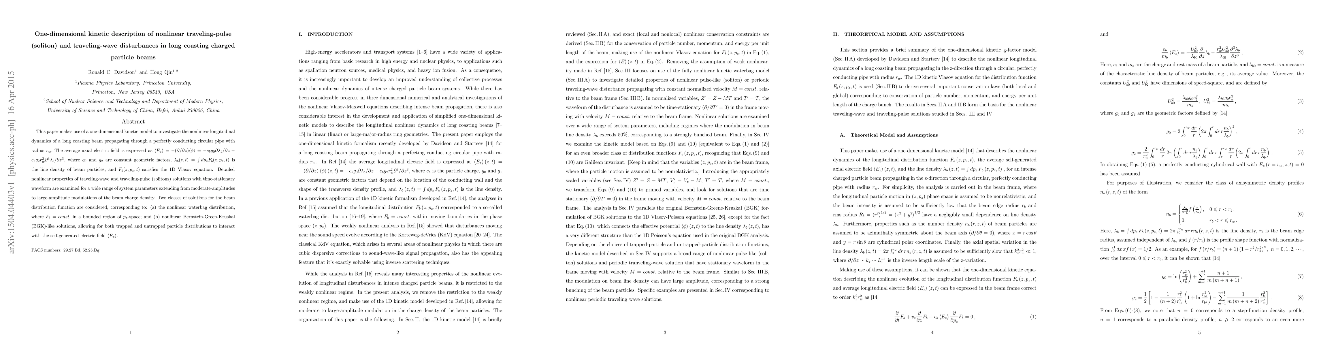 This paper makes use of a one-dimensional kinetic model to investigate the nonlinear longitudinal dynamics of a long coasting beam propagating through a perfectly conducting circular pipe with radius $r_{w}$. The average axial electric field is expressed as $\langle E_{z}\rangle=-(\partial/\partial z)\langle\phi\rangle=-e_{b}g_{0}\partial\lambda_{b}/\partial z-e_{b}g_{2}r_{w}^{2}\partial^{3}\lambda_{b}/\partial z^{3}$, where $g_{0}$ and $g_{2}$ are constant geometric factors, $\lambda_{b}(z,t)=\int dp_{z}F_{b}(z,p_{z},t)$ is the line density of beam particles, and $F_{b}(z,p_{z},t)$ satisfies the 1D Vlasov equation. Detailed nonlinear properties of traveling-wave and traveling-pulse (solitons) solutions with time-stationary waveform are examined for a wide range of system parameters extending from moderate-amplitudes to large-amplitude modulations of the beam charge density. Two classes of solutions for the beam distribution function are considered, corresponding to: (a) the nonlinear waterbag distribution, where $F_{b}=const.$ in a bounded region of $p_{z}$-space; and (b) nonlinear Bernstein-Green-Kruskal (BGK)-like solutions, allowing for both trapped and untrapped particle distributions to interact with the self-generated electric field $\langle E_{z}\rangle$. .
