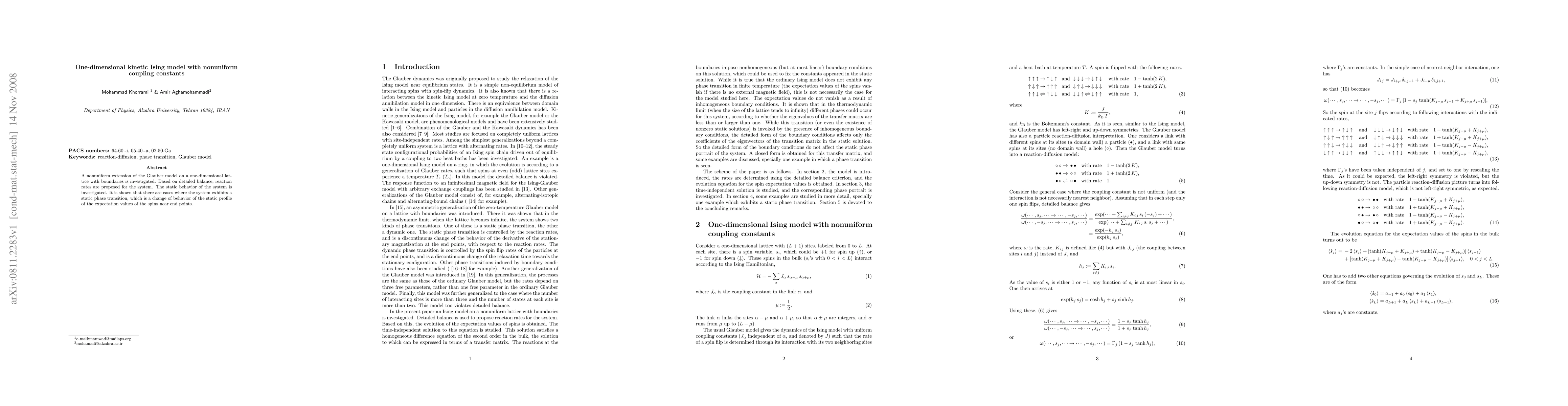 This paper investigates a nonuniform one-dimensional kinetic Ising model with varying coupling constants. It proposes reaction rates based on detailed balance and examines the static behavior, revealing static phase transitions in the system's spin expectation values near the boundaries.