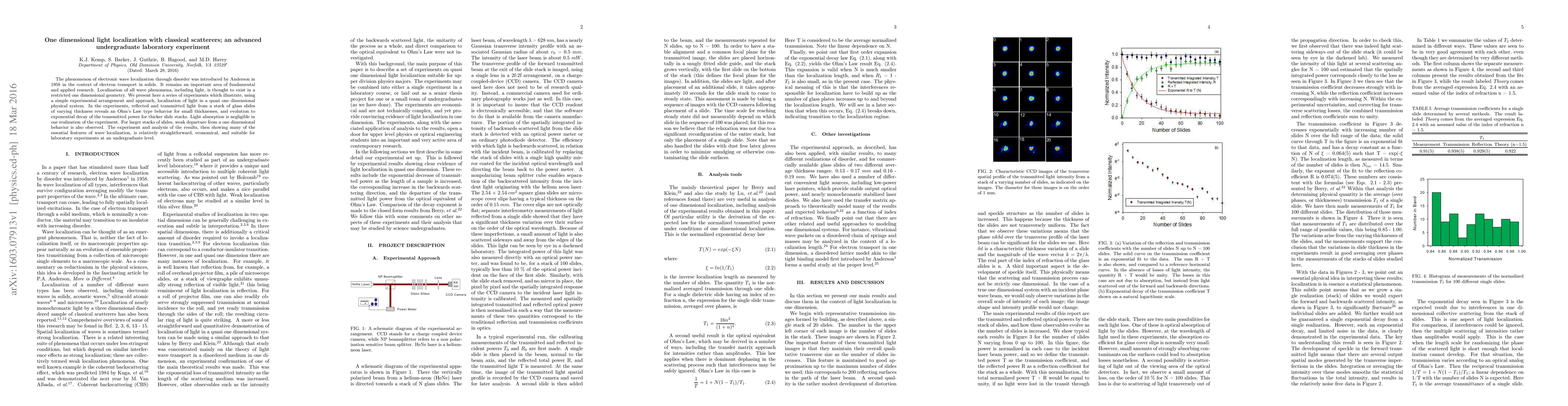 Researchers demonstrate light localization in a quasi-one dimensional system using glass slide stacks, exhibiting Ohm's Law behavior at small thicknesses and exponential decay for thicker stacks.