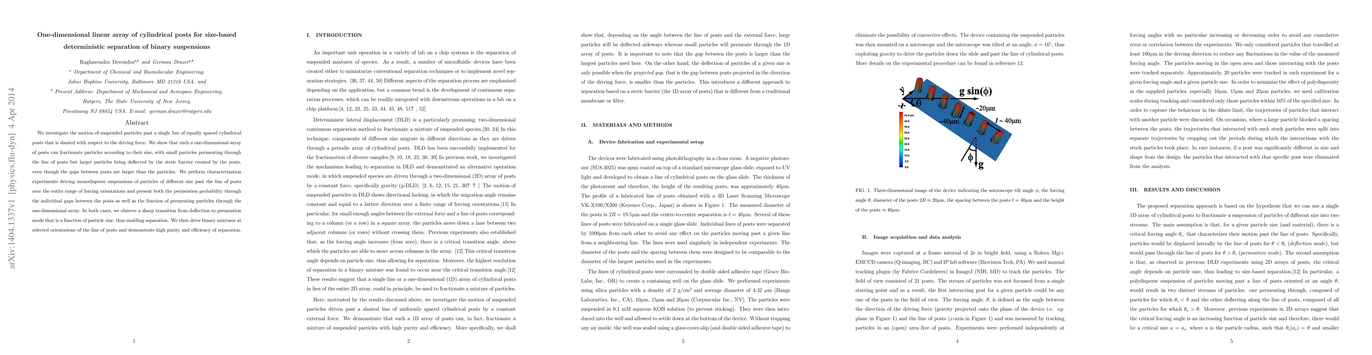 This study explores how a slanted linear array of cylindrical posts can deterministically separate binary suspensions based on particle size, with smaller particles passing through and larger particles being deflected by steric hindrance, even when gaps are larger than the particles. Experiments reveal a sharp transition in separation efficiency as a function of particle size, enabling high-purity separation of mixtures.
