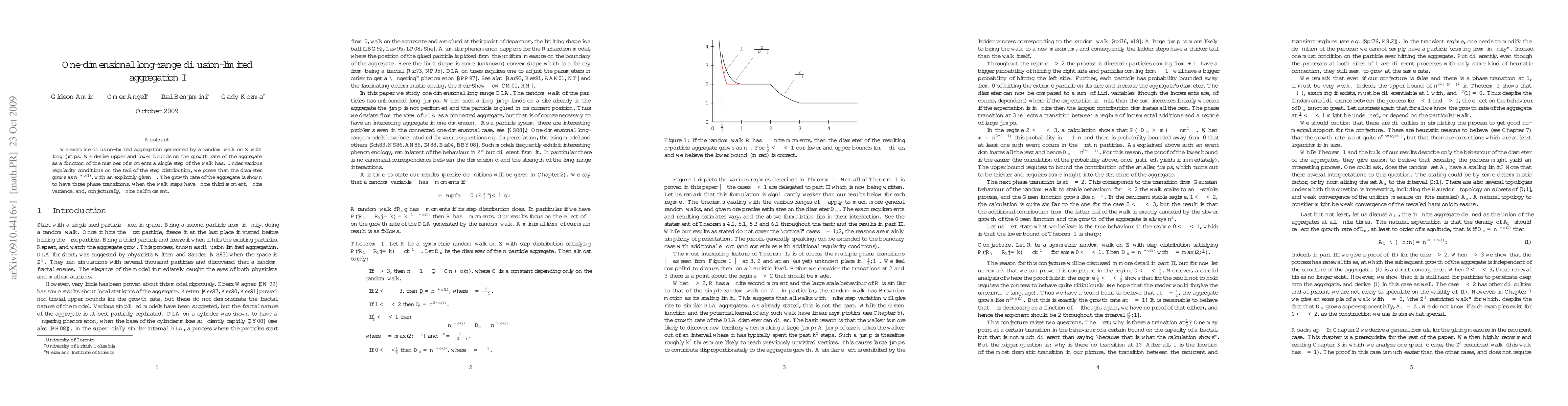 This paper investigates diffusion-limited aggregation on a one-dimensional lattice with long jumps from a random walk. It establishes bounds on the aggregate's growth rate and demonstrates three phase transitions based on the moments of the step distribution, revealing the diameter's scaling behavior as n^(beta+o(1)).