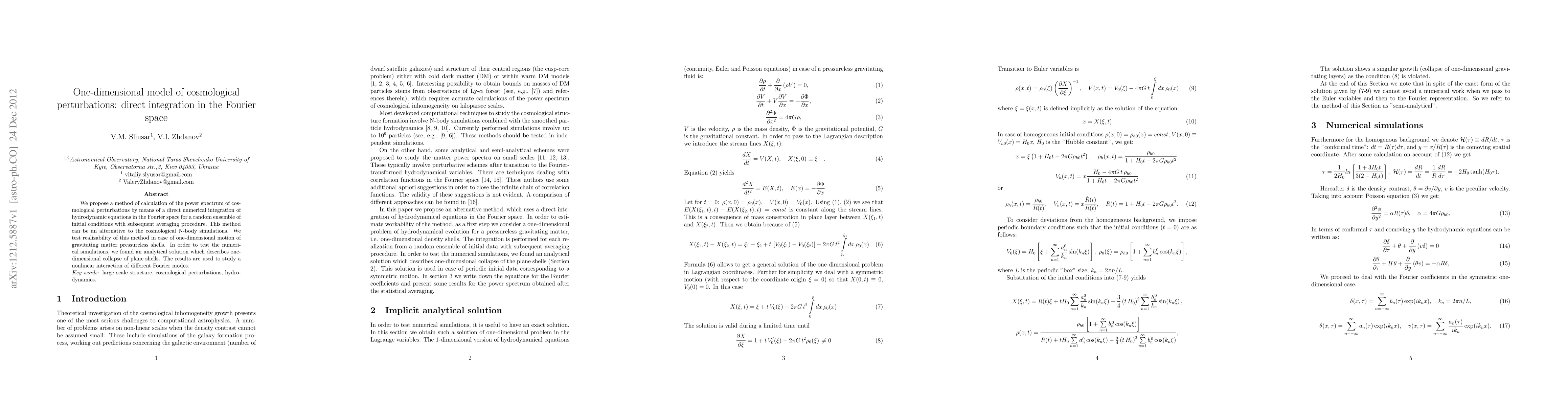 We propose a method of calculation of the power spectrum of cosmological perturbations by means of a direct numerical integration of hydrodynamic equations in the Fourier space for a random ensemble of initial conditions with subsequent averaging procedure. This method can be an alternative to the cosmological N-body simulations. We test realizability of this method in case of one-dimensional motion of gravitating matter pressureless shells. In order to test the numerical simulations, we found an analytical solution which describes one-dimensional collapse of plane shells. The results are used to study a nonlinear interaction of different Fourier modes.