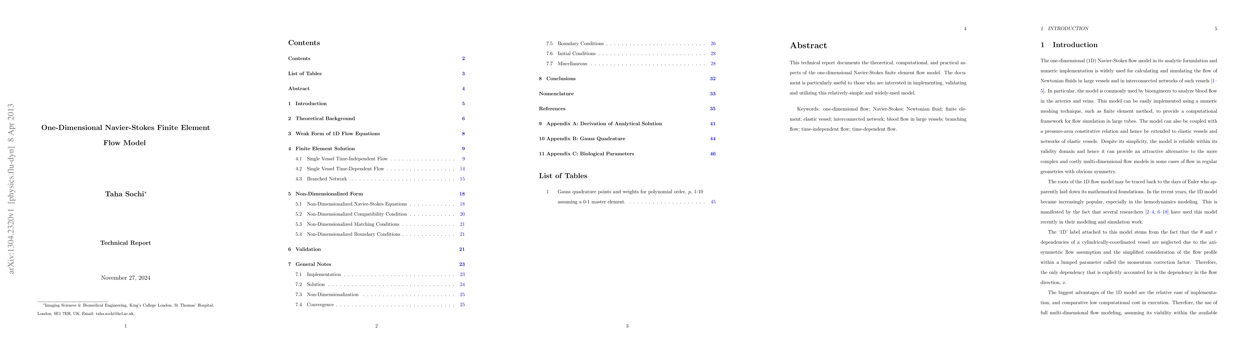 This technical report documents the theoretical, computational, and practical aspects of the one-dimensional Navier-Stokes finite element flow model. The document is particularly useful to those who are interested in implementing, validating and utilizing this relatively-simple and widely-used model.