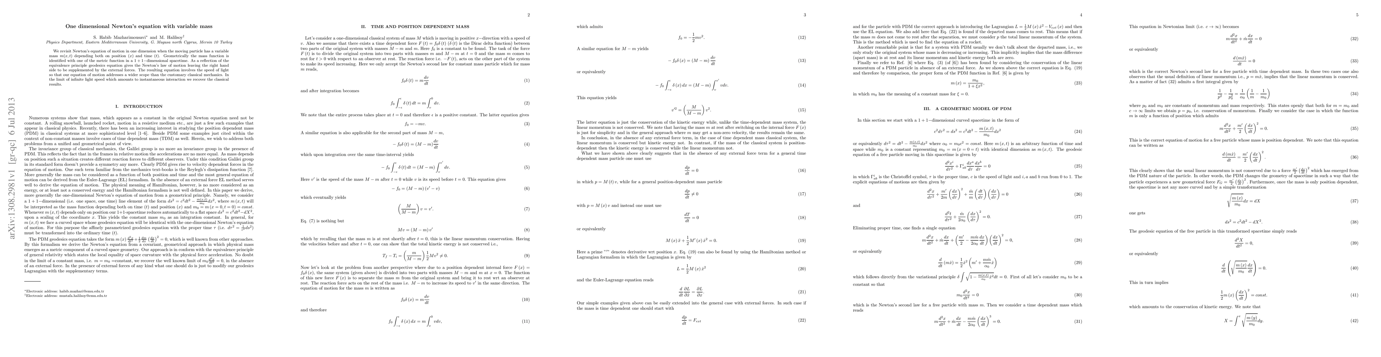 This paper examines Newton's equation of motion for a particle with variable mass in one dimension, identifying the mass function as a metric component in a 1+1-dimensional spacetime. The derived equation incorporates the speed of light, extending beyond classical mechanics, and reverts to classical results under the assumption of infinite light speed.
