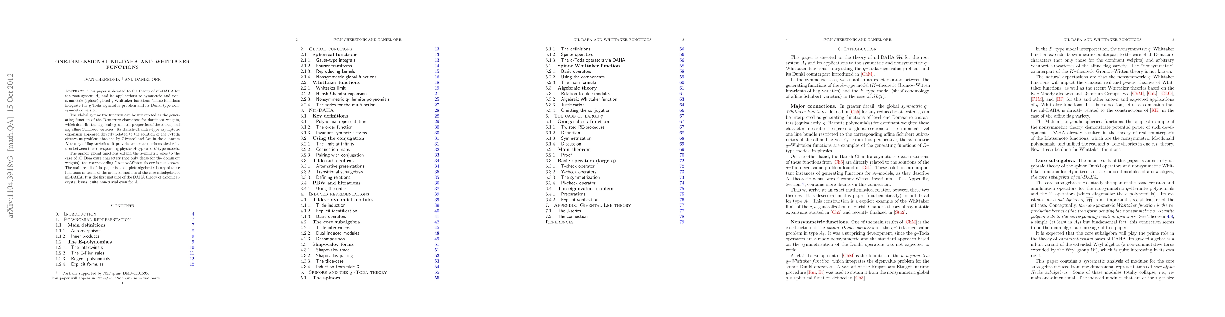 This work, to be published in Transformation Groups in two parts, is devoted to the theory of nil-DAHA for the root system A_1 and its applications to symmetric and nonsymmetric (spinor) global q-Whittaker functions. These functions integrate the q-Toda eigenvalue problem and its Dunkl-type nonsymmetric version. The global symmetric function can be interpreted as the generating function of the Demazure characters for dominant weights, which describe the algebraic-geometric properties of the corresponding affine Schubert varieties. Its Harish-Chandra-type asymptotic expansion appeared directly related to the solution of the q-Toda eigenvalue problem obtained by Givental and Lee in the quantum K-theory of flag varieties. It provides an exact mathematical relation between the corresponding physics A-type and B-type models. The spinor global functions extend the symmetric ones to the case of all Demazure characters (not only those for the dominant weights); the corresponding Gromov-Witten theory is not known. The main result of the paper is a complete algebraic theory of these functions in terms of the induced modules of the core subalgebra of nil-DAHA. It is the first instance of the DAHA theory of canonical-crystal bases, quite non-trivial even for A_1.