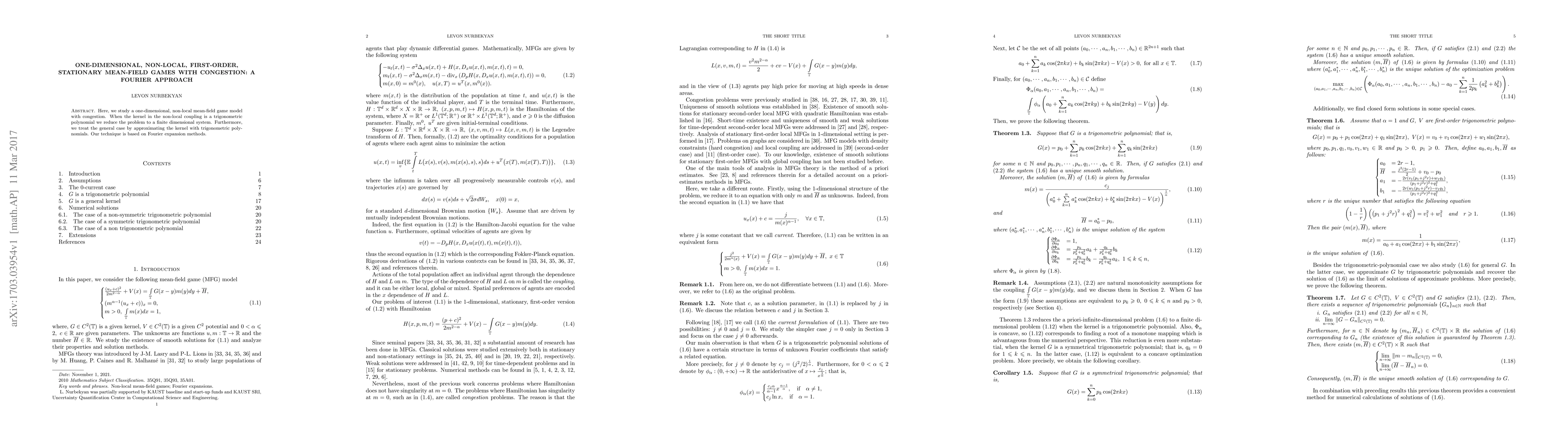 The paper employs a Fourier approach to analyze a one-dimensional, non-local mean-field game model with congestion, reducing the problem to a finite-dimensional system for kernels that are trigonometric polynomials. The general case is approximated by trigonometric polynomials.