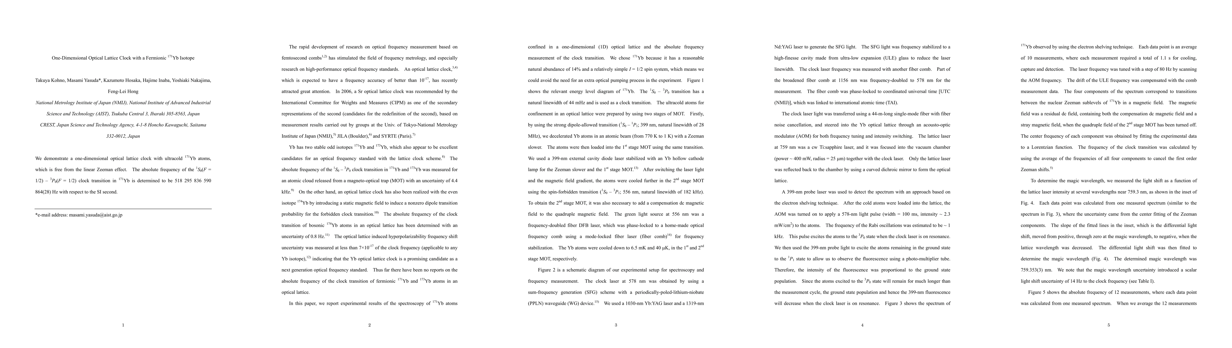 This paper presents a one-dimensional optical lattice clock using ultracold 171Yb atoms, achieving a precise measurement of the clock transition frequency at 518 295 836 590 864(28) Hz, free from the linear Zeeman effect.