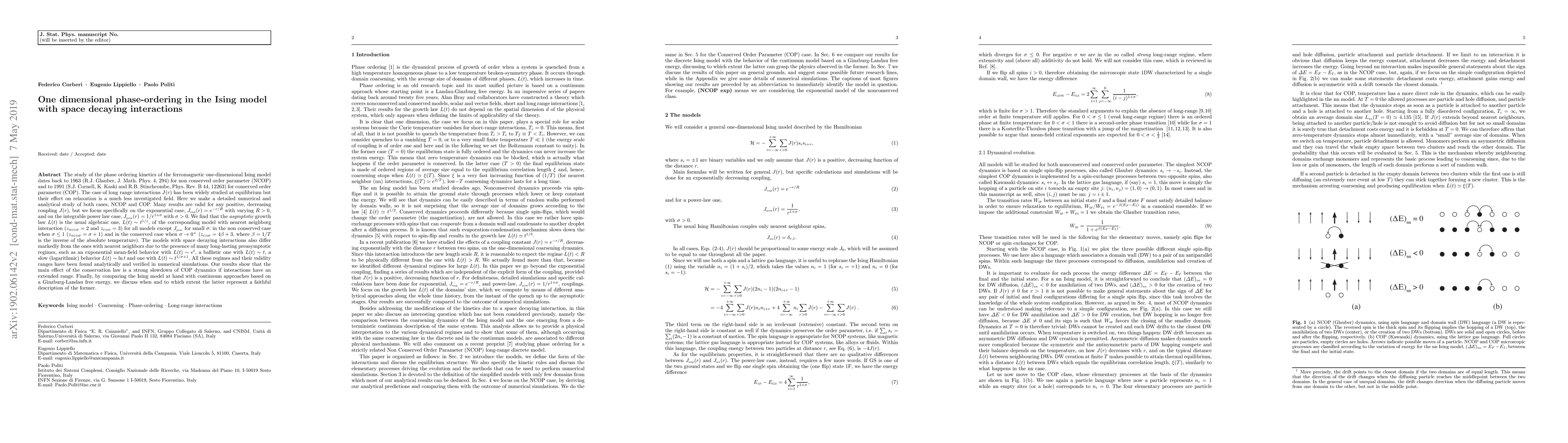 The study of the phase ordering kinetics of the ferromagnetic one-dimensional Ising model dates back to 1963 for non conserved order parameter (NCOP) and to 1991 for conserved order parameter (COP). The case of long range interactions $J(r)$ has been widely studied at equilibrium but their effect on relaxation is a much less investigated field. Here we make a detailed numerical and analytical study of both cases, NCOP and COP. Many results are valid for any positive, decreasing coupling $J(r)$, but we focus specifically on the exponential case, $J_{exp}(r)=e^{-r/R}$ with varying $R>0$, and on the integrable power law case, $J_{pow}(r) =1/r^{1+\sigma}$ with $\sigma > 0$. We find that the {\it asymptotic} growth law $L(t)$ is the usual algebraic one, $L(t)\sim t^{1/z}$, of the corresponding model with nearest neighborg interaction ($z_{NCOP}=2$ and $z_{COP}=3$) for all models except $J_{pow}$ for small $\sigma$: in the non conserved case when $\sigma\le 1$ ($z_{NCOP}=\sigma+1$) and in the conserved case when $\sigma\to 0^+$ ($z_{COP}=4\beta+3$, where $\beta=1/T$ is the inverse of the absolute temperature). The models with space decaying interactions also differ markedly from the ones with nearest neighbors due to the presence of many long-lasting preasymptotic regimes, such as an exponential mean-field behavior with $L(t)\sim e^{t}$, a ballistic one with $L(t)\sim t$, a slow (logarithmic) behavior $L(t)\sim \ln t$ and one with $L(t)\sim t^{1/\sigma+1}$. All these regimes and their validity ranges have been found analytically and verified in numerical simulations. Our results show that the main effect of the conservation law is a strong slowdown of COP dynamics if interactions have an extended range. Finally, we compare the Ising model at hand with continuum approaches based on a Ginzburg-Landau free energy.