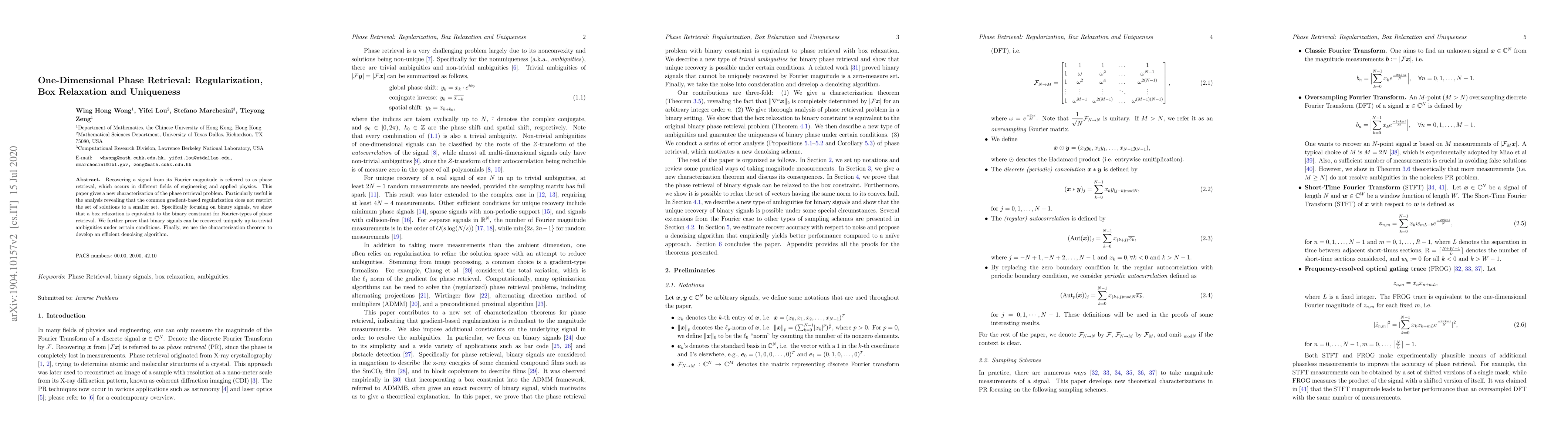 This paper characterizes the phase retrieval problem, demonstrating that gradient-based regularization does not limit solution sets. It shows that box relaxation is equivalent to binary constraints in Fourier-type phase retrieval and proves unique recovery of binary signals under specific conditions, leading to an efficient denoising algorithm.