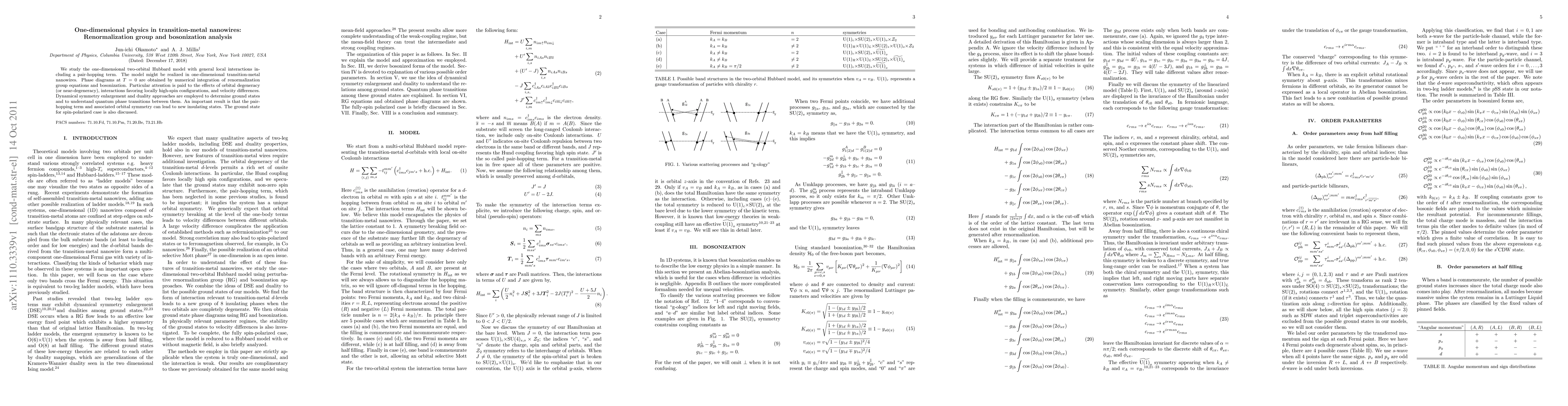 We study the one-dimensional two-orbital Hubbard model with general local interactions including a pair-hopping term. The model might be realized in one-dimensional transition-metal nanowires. Phase diagrams at T=0 are obtained by numerical integration of renormalization group equations and bosonization. Particular attention is paid to the effects of orbital degeneracy (or near-degeneracy), interactions favoring locally high-spin configurations, and velocity differences. Dynamical symmetry enlargement and duality approaches are employed to determine ground states and to understand quantum phase transitions between them. An important result is that the pair-hopping term and associated orbital symmetry can lead to new insulating states. The ground state for spin-polarized case is also discussed.