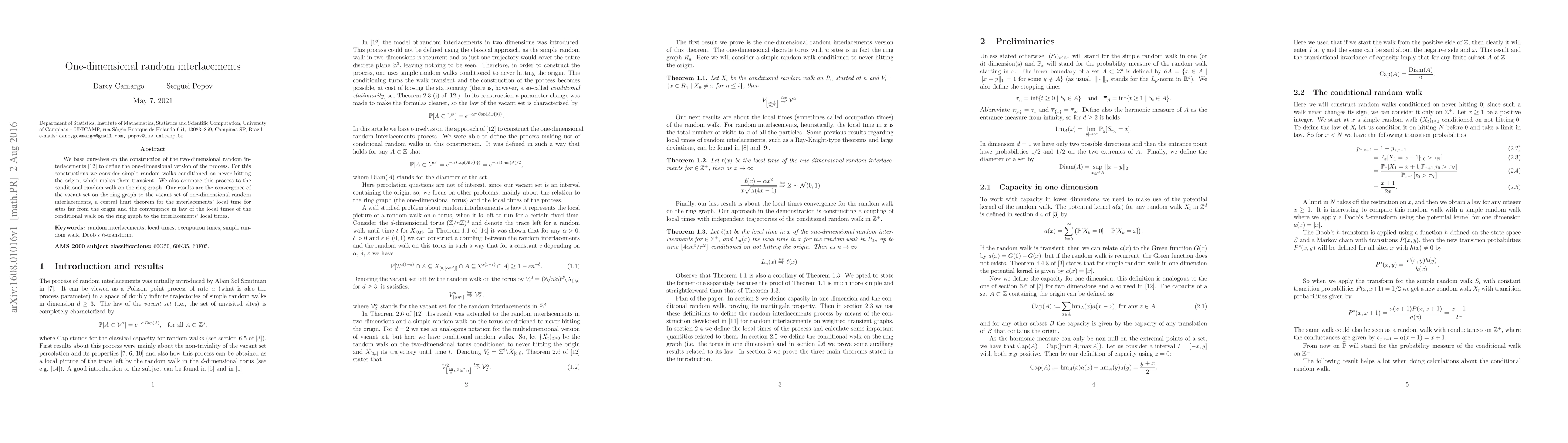 This paper introduces one-dimensional random interlacements based on conditioned transient random walks, comparing it to a conditional random walk on the ring graph. Key results include the convergence of the vacant set, a central limit theorem for interlacements' local times, and the convergence of local times between the two processes.