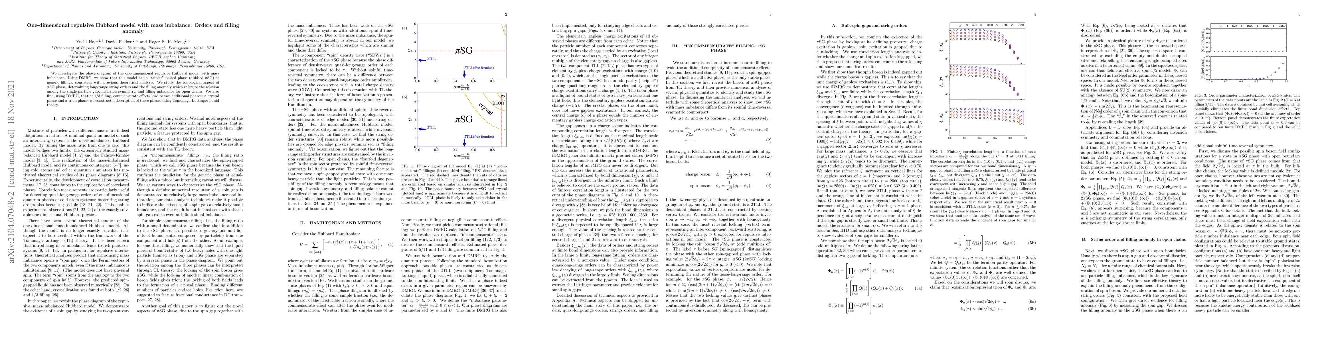 We investigate the phase diagram of the one-dimensional repulsive Hubbard model with mass imbalance. Using DMRG, we show that this model has a "triplet" paired phase (dubbed $\pi \mathrm{SG}$) at generic fillings, consistent with previous theoretical analysis. We study the topological aspect of $\pi \mathrm{SG}$ phase, determining long-range string orders and the filling anomaly which refers to the relation among the single particle gap, inversion symmetry, and filling imbalance for open chains. We also find, using DMRG, that at $1/3$ filling, commensurate effects lead to two additional phases: a crystal phase and a trion phase; we construct a description of these phases using Tomonaga-Luttinger liquid theory.