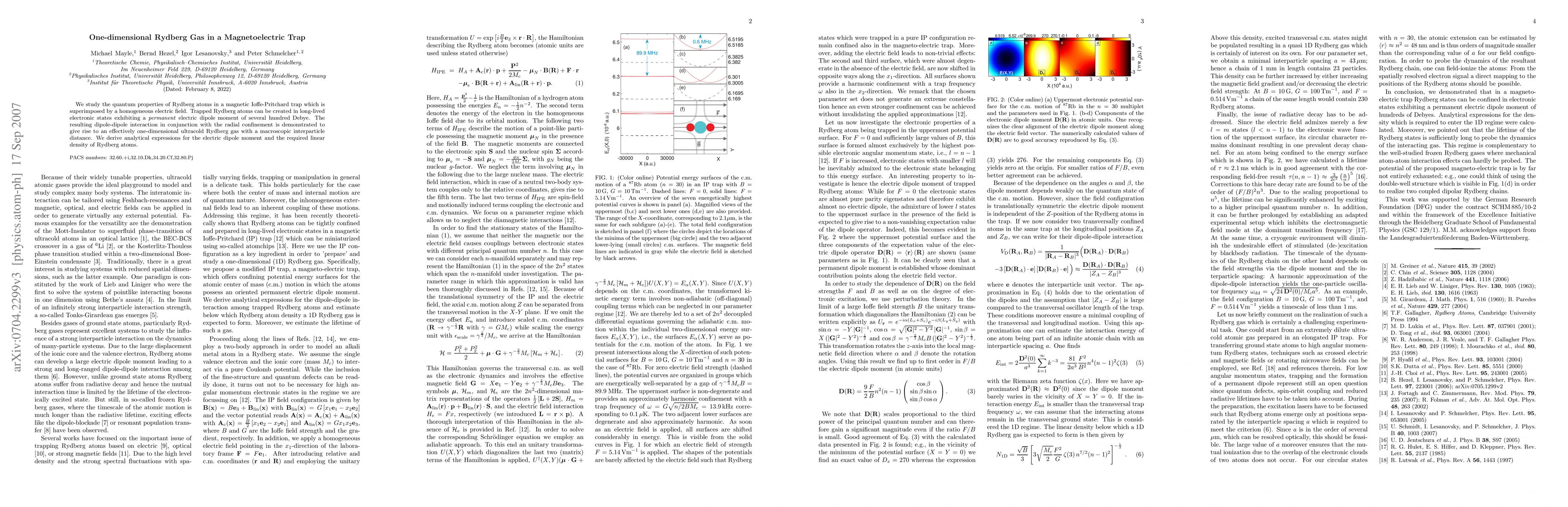 We study the quantum properties of Rydberg atoms in a magnetic Ioffe-Pritchard trap which is superimposed by a homogeneous electric field. Trapped Rydberg atoms can be created in long-lived electronic states exhibiting a permanent electric dipole moment of several hundred Debye. The resulting dipole-dipole interaction in conjunction with the radial confinement is demonstrated to give rise to an effectively one-dimensional ultracold Rydberg gas with a macroscopic interparticle distance. We derive analytical expressions for the electric dipole moment and the critical linear density of Rydberg atoms.