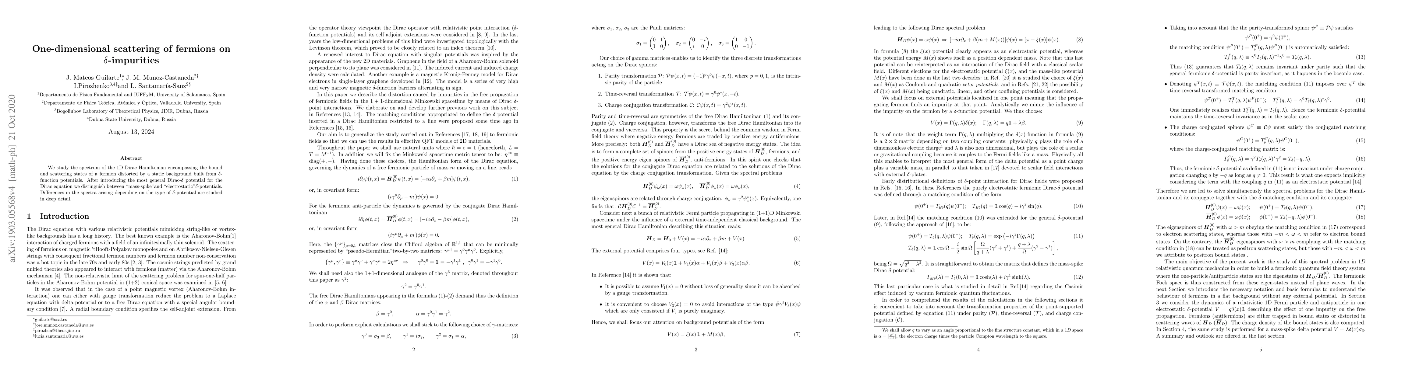 This paper investigates the spectrum of a 1D Dirac Hamiltonian for fermions interacting with $\delta$-function potentials, distinguishing between "mass-spike" and "electrostatic" types, and explores the resulting differences in bound and scattering states.