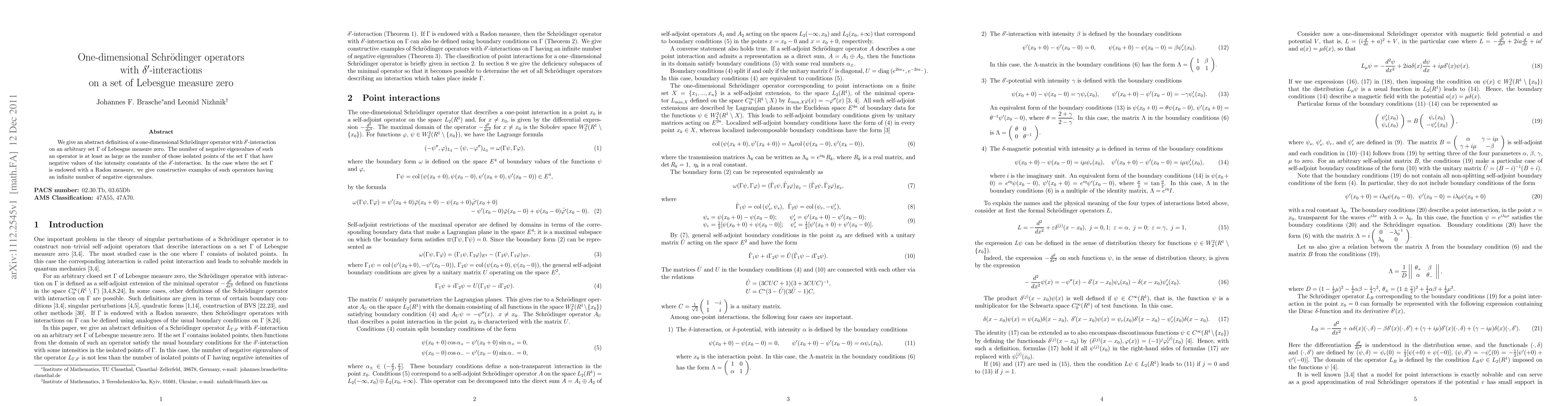 We give an abstract definition of a one-dimensional Schr\"odinger operator with $\delta'$-interaction on an arbitrary set~$\Gamma$ of Lebesgue measure zero. The number of negative eigenvalues of such an operator is at least as large as the number of those isolated points of the set~$\Gamma$ that have negative values of the intensity constants of the $\delta'$-interaction. In the case where the set~$\Gamma$ is endowed with a Radon measure, we give constructive examples of such operators having an infinite number of negative eigenvalues.