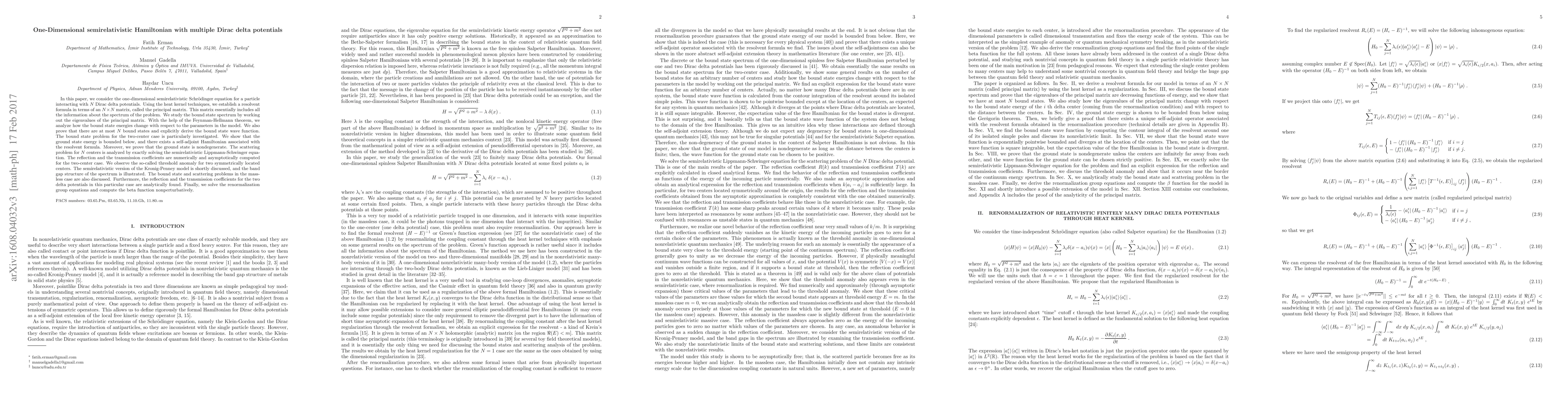 This paper investigates the one-dimensional semirelativistic Schrödinger equation with multiple Dirac delta potentials, establishing a resolvent formula using heat kernel techniques. It analyzes the bound state spectrum through the eigenvalues of a principal matrix and employs the Feynman-Hellmann theorem to study energy changes. The study also examines scattering problems and finds threshold anomalies in the two-center case, concluding with a discussion on the massless case and renormalization group computations.
