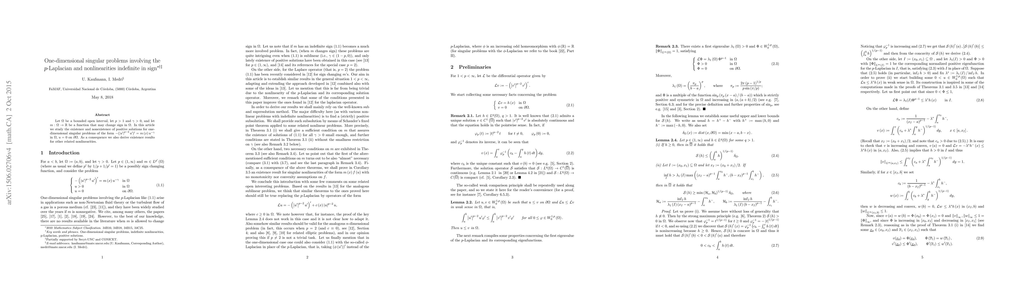 Let $\Omega$ be a bounded open interval, let $p>1$ and $\gamma>0$, and let $m:\Omega\rightarrow\mathbb{R}$ be a function that may change sign in $\Omega $. In this article we study the existence and nonexistence of positive solutions for one-dimensional singular problems of the form $-(\left\vert u^{\prime}\right\vert ^{p-2}u^{\prime})^{\prime}=m\left( x\right) u^{-\gamma}$ in $\Omega$, $u=0$ on $\partial\Omega$. As a consequence we also derive existence results for other related nonlinearities.