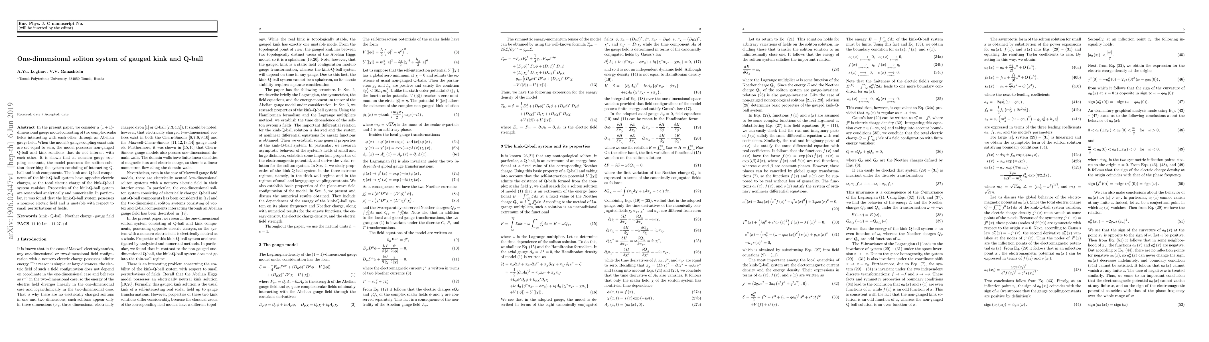 This paper investigates a $(1+1)$-dimensional gauge model with two complex scalar fields and an Abelian gauge field, revealing soliton solutions at nonzero gauge coupling constants that describe interacting Q-ball and kink components. The system is found to be unstable and possesses a nonzero electric field.
