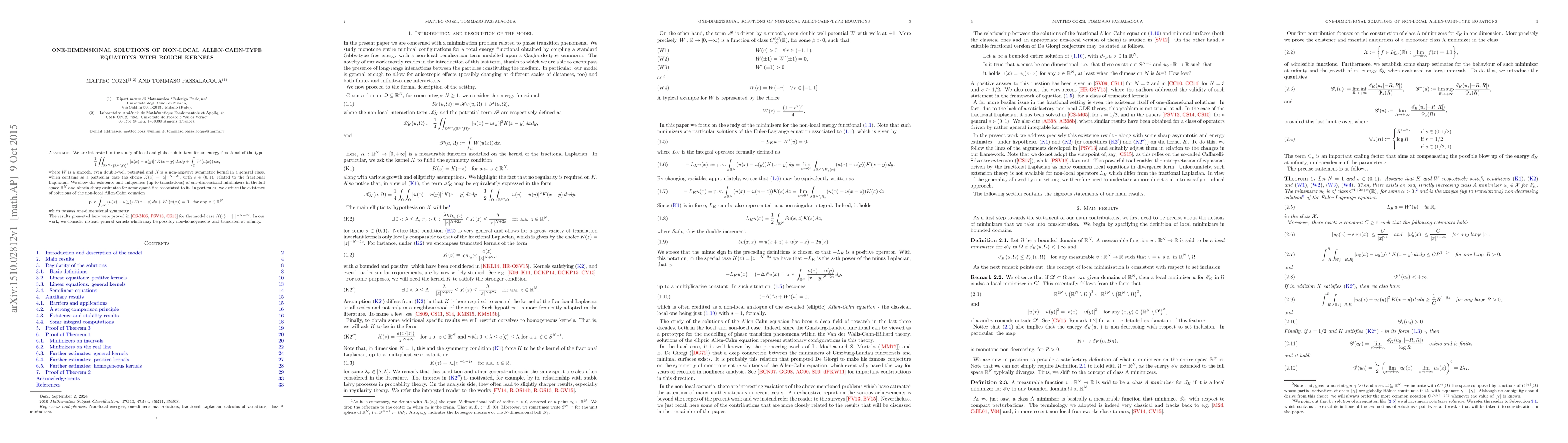 We are interested in the study of local and global minimizers for an energy functional of the type $$ \frac{1}{4} \iint_{\mathbb{R}^{2 N} \setminus \left( \mathbb{R}^N \setminus \Omega \right)^2} |u(x) - u(y)|^2 K(x - y) \, dx dy + \int_{\Omega} W(u(x)) \, dx, $$ where $W$ is a smooth, even double-well potential and $K$ is a non-negative symmetric kernel in a general class, which contains as a particular case the choice $K(z) = |z|^{- N - 2 s}$, with $s \in (0, 1)$, related to the fractional Laplacian. We show the existence and uniqueness (up to translations) of one-dimensional minimizers in the full space $\mathbb{R}^N$ and obtain sharp estimates for some quantities associated to it. In particular, we deduce the existence of solutions of the non-local Allen-Cahn equation $$ \mbox{p.v.} \int_{\mathbb{R}^N} \left( u(x) - u(y) \right) K(x - y) \, dy + W'(u(x)) = 0 \quad \mbox{for any } x \in \mathbb{R}^N, $$ which possess one-dimensional symmetry. The results presented here were proved in (Cabr\'e and Sol\`a-Morales, 2005), (Palatucci, Savin and Valdinoci, 2013) and (Cabr\'e and Sire, 2015) for the model case $K(z) = |z|^{- N - 2 s}$. In our work, we consider instead general kernels which may be possibly non-homogeneous and truncated at infinity.