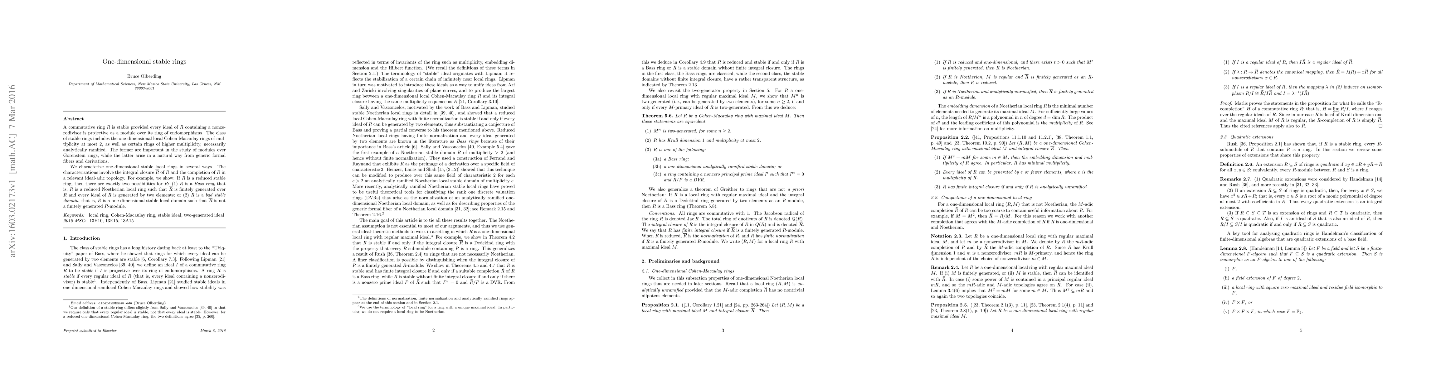 This paper characterizes one-dimensional stable local rings, showing that they are either Bass rings or bad stable domains, with the latter involving rings whose integral closure is not finitely generated. The study is significant for understanding modules over Gorenstein rings and formal fibers.