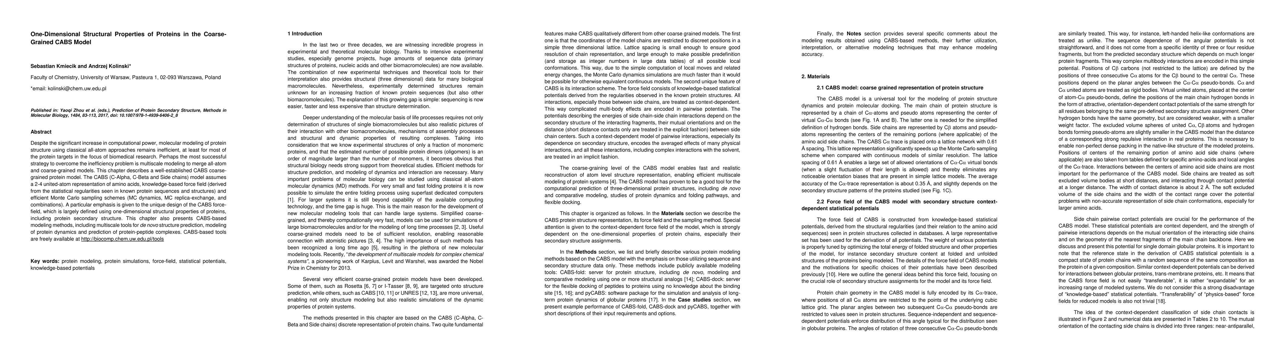 This paper discusses the CABS coarse-grained protein model, emphasizing its one-dimensional structural properties and knowledge-based force field, which enhances efficiency in protein structure modeling. It also presents multiscale modeling methods for de novo structure prediction and protein dynamics.
