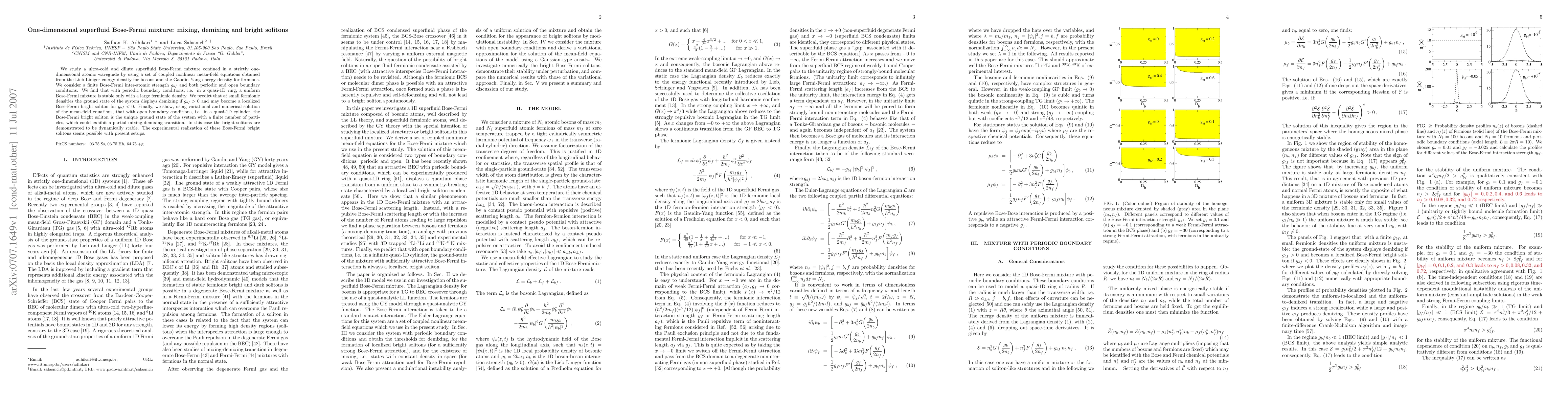 We study a ultra-cold and dilute superfluid Bose-Fermi mixture confined in a strictly one-dimensional atomic waveguide by using a set of coupled nonlinear mean-field equations obtained from the Lieb-Liniger energy density for bosons and the Gaudin-Yang energy density for fermions. We consider a finite Bose-Fermi inter-atomic strength g_{bf} and both periodic and open boundary conditions. We find that with periodic boundary conditions, i.e. in a quasi-1D ring, a uniform Bose-Fermi mixture is stable only with a large fermionic density. We predict that at small fermionic densities the ground state of the system displays demixing if g_{bf}>0 and may become a localized Bose-Fermi bright soliton for g_{bf}<0. Finally, we show, using variational and numerical solution of the mean-field equations, that with open boundary conditions, i.e. in a quasi-1D cylinder, the Bose-Fermi bright soliton is the unique ground state of the system with a finite number of particles, which could exhibit a partial mixing-demixing transition. In this case the bright solitons are demonstrated to be dynamically stable. The experimental realization of these Bose-Fermi bright solitons seems possible with present setups.
