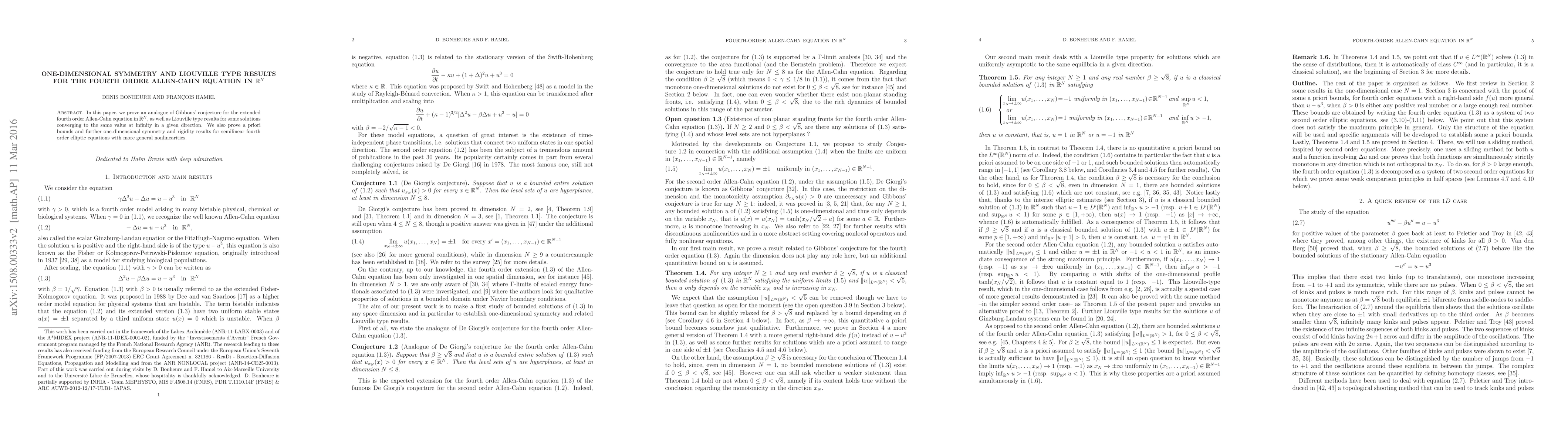 In this paper, we prove an analogue of Gibbons' conjecture for the extended fourth order Allen-Cahn equation in R N , as well as Liouville type results for some solutions converging to the same value at infinity in a given direction. We also prove a priori bounds and further one-dimensional symmetry and rigidity results for semilinear fourth order elliptic equations with more general nonlinearities.