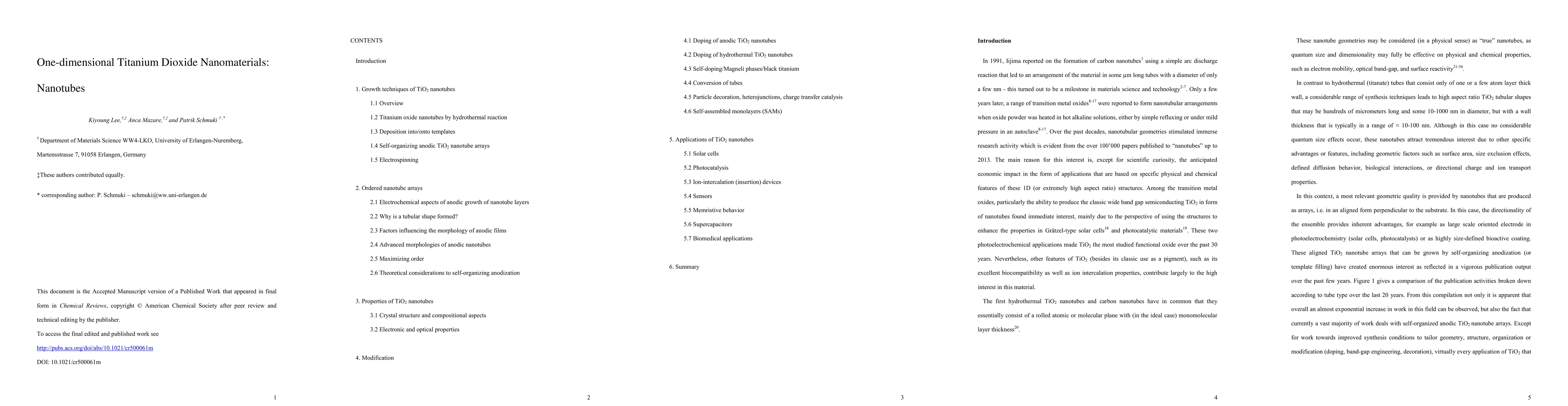 In the present review we try to give a comprehensive and most up to date view to the field, with an emphasis on the currently most investigated anodic TiO2 nanotube arrays. We will first give an overview of different synthesis approaches to produce TiO2 nanotubes and TiO2 nanotube arrays, and then deal with physical and chemical properties of TiO2 nanotubes and techniques to modify them. Finally, we will provide an overview of the most explored and prospective applications of nanotubular TiO2.