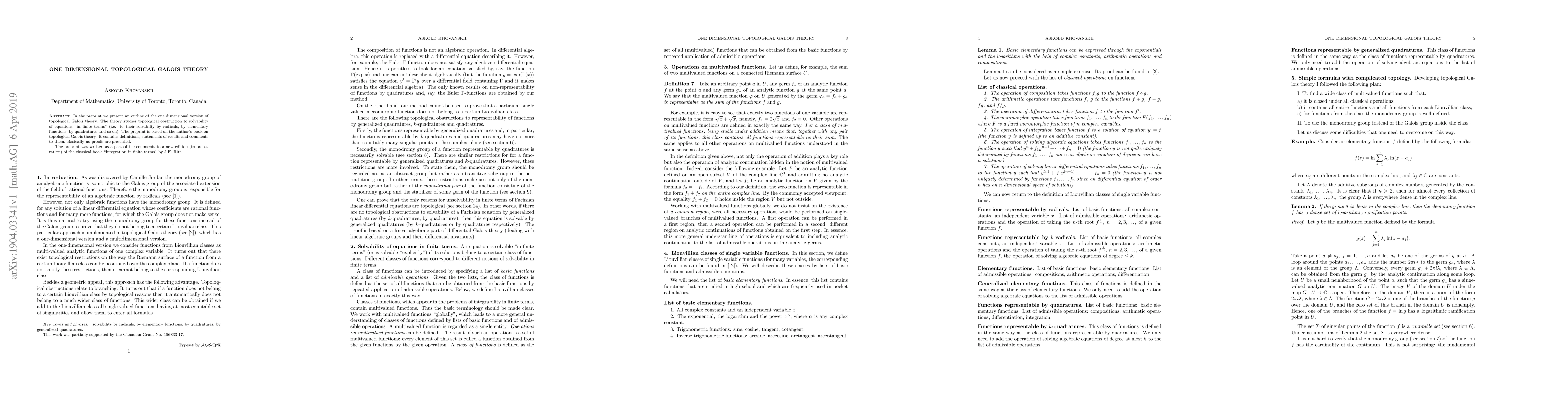 This paper outlines a one-dimensional version of topological Galois theory, focusing on topological obstructions to solving equations in finite terms. It provides definitions, results, and comments but lacks detailed proofs, serving as a companion to a new edition of Ritt's "Integration in finite terms."
