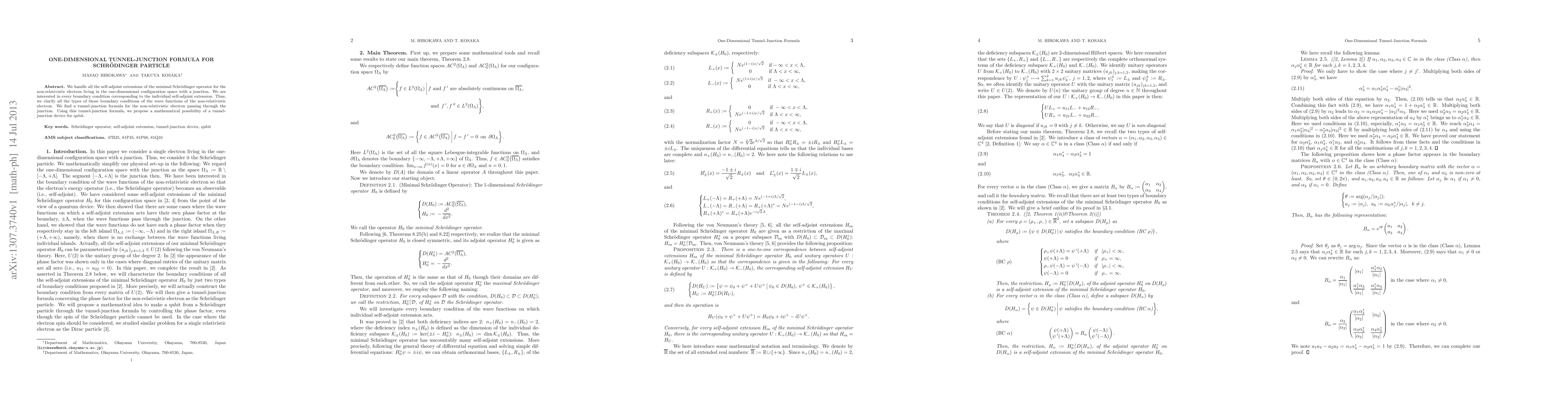We handle all the self-adjoint extensions of the minimal Schroedinger operator for the non-relativistic electron living in the one-dimensional configuration space with a junction. We are interested in every boundary condition corresponding to the individual self-adjoint extension. Thus, we clarify all the types of those boundary conditions of the wave functions of the non-relativistic electron. We find a tunnel-junction formula for the non-relativistic electron passing through the junction. Using this tunnel-junction formula, we propose a mathematical possibility of a tunnel-junction device for qubit.