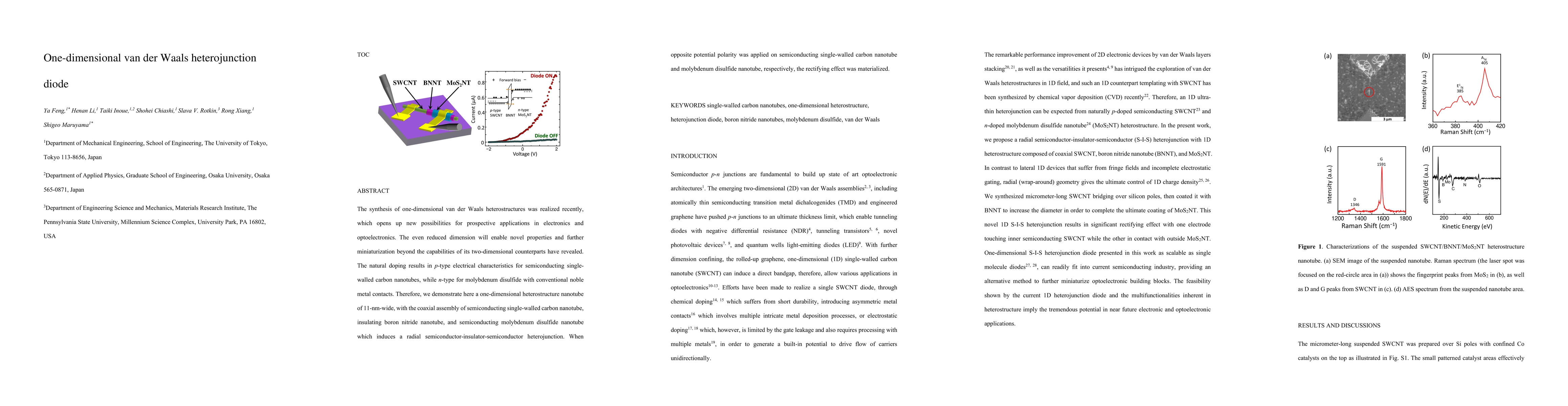 This paper reports the synthesis of a one-dimensional van der Waals heterojunction diode using a coaxial assembly of semiconducting single-walled carbon nanotube, insulating boron nitride nanotube, and semiconducting molybdenum disulfide nanotube, demonstrating a rectifying effect under applied potential polarity.