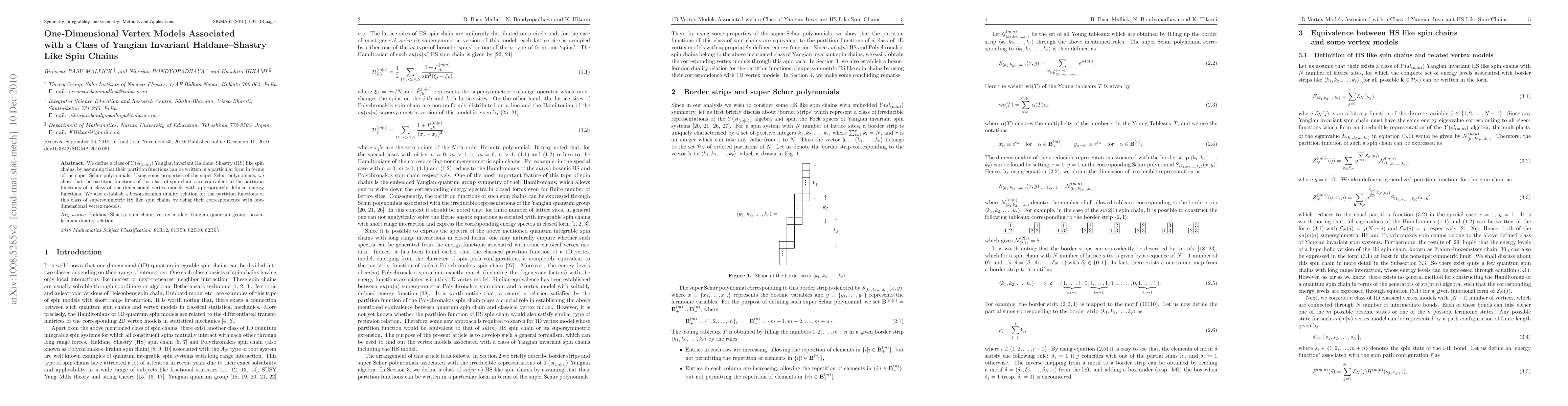 This paper defines a class of Yangian invariant Haldane-Shastry-like spin chains whose partition functions are expressed in terms of super Schur polynomials. It establishes an equivalence between these spin chains and one-dimensional vertex models, and demonstrates a boson-fermion duality relation through this correspondence.