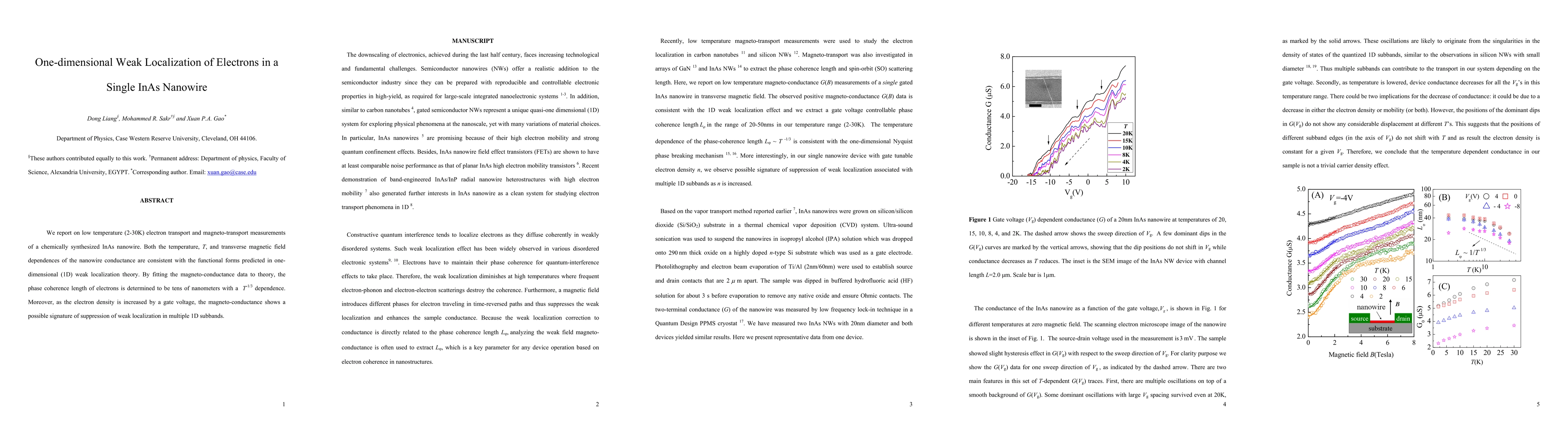 This study investigates the electron transport in a single InAs nanowire, finding that its conductance behavior aligns with one-dimensional weak localization theory. The phase coherence length is determined to be tens of nanometers, showing a T-1/3 dependence, and weak localization is potentially suppressed in multiple 1D subbands with increased electron density.
