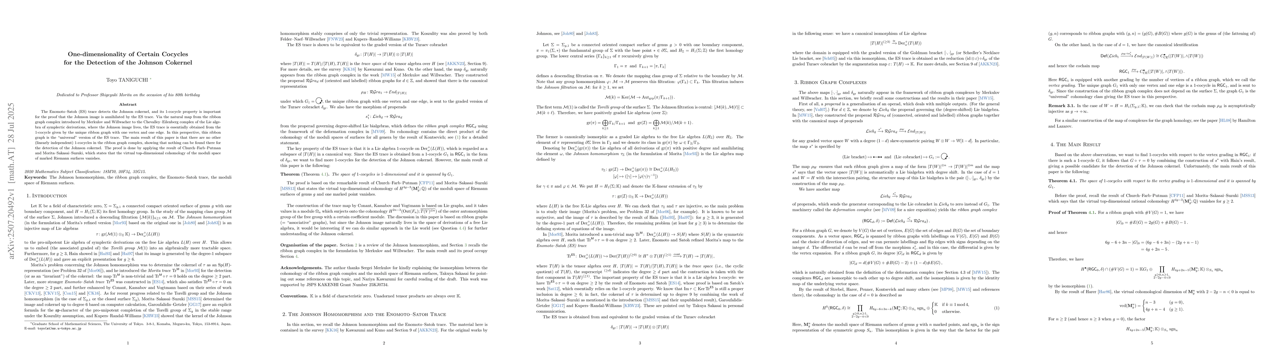 The Enomoto-Satoh (ES) trace detects the Johnson cokernel, and its 1-cocycle property is important for the proof that the Johnson image is annihilated by the ES trace. Via the natural map from the ribbon graph complex introduced by Merkulov and Willwacher to the Chevalley-Eilenberg complex of the Lie algebra of symplectic derivations, where the Johnson image lives, the ES trace is essentially obtained from the 1-cocycle given by the unique ribbon graph with one vertex and one edge. In this perspective, this ribbon graph is the "universal" version of the ES trace. The main result of this paper is that there are no other (linearly independent) 1-cocycles in the ribbon graph complex, showing that nothing can be found there for the detection of the Johnson cokernel. The proof is done by applying the result of Church-Farb-Putman and Morita-Sakasai-Suzuki, which states that the virtual top-dimensional cohomology of the moduli space of marked Riemann surfaces vanishes.