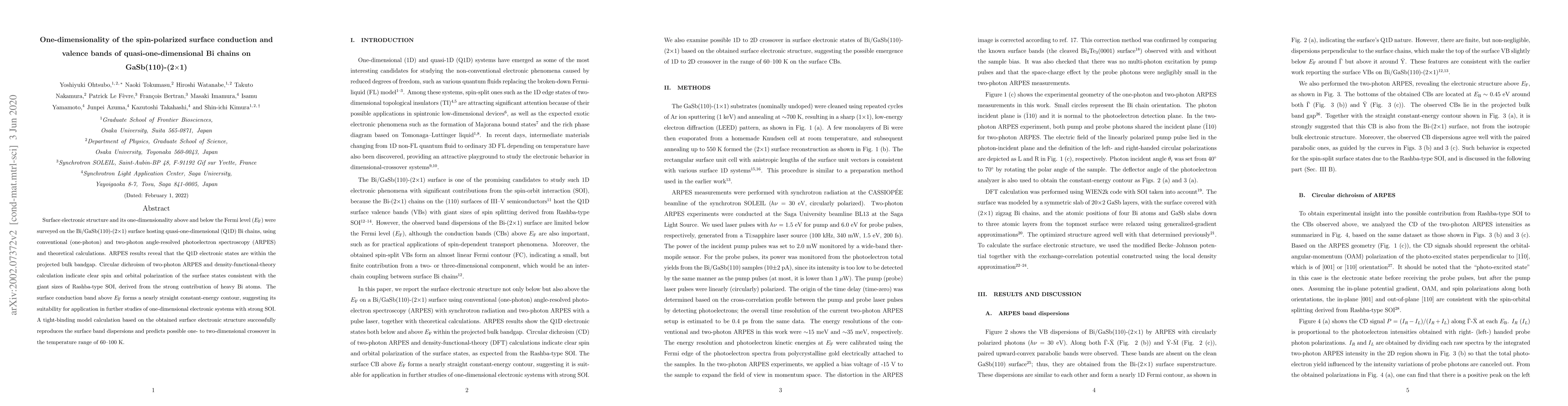 Surface electronic structure and its one-dimensionality above and below the Fermi level ($E_{\rm F}$) were surveyed on the Bi/GaSb(110)-(2$\times$1) surface hosting quasi-one-dimensional (Q1D) Bi chains, using conventional (one-photon) and two-photon angle-resolved photoelectron spectroscopy (ARPES) and theoretical calculations. ARPES results reveal that the Q1D electronic states are within the projected bulk bandgap. Circular dichroism of two-photon ARPES and density-functional-theory calculation indicate clear spin and orbital polarization of the surface states consistent with the giant sizes of Rashba-type SOI, derived from the strong contribution of heavy Bi atoms. The surface conduction band above $E_{\rm F}$ forms a nearly straight constant-energy contour, suggesting its suitability for application in further studies of one-dimensional electronic systems with strong SOI. A tight-binding model calculation based on the obtained surface electronic structure successfully reproduces the surface band dispersions and predicts possible one- to two-dimensional crossover in the temperature range of 60--100~K.
