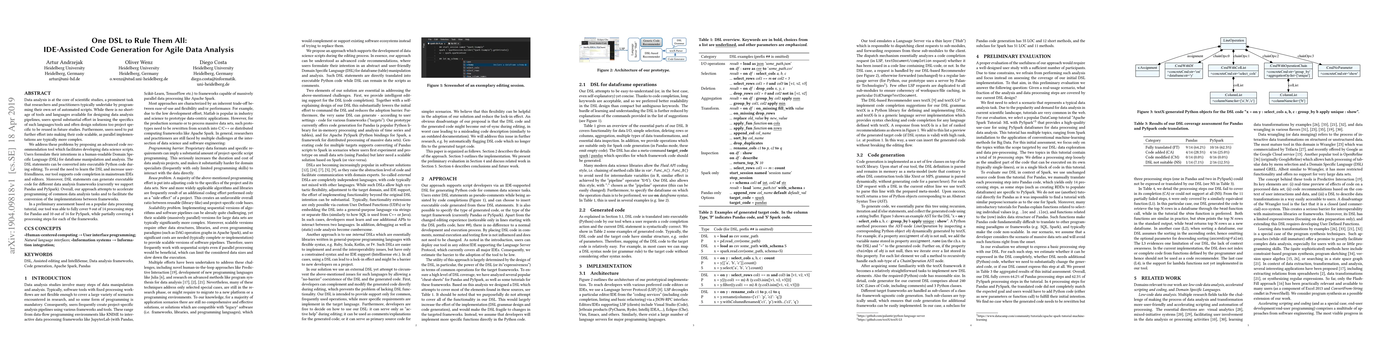 Data analysis is at the core of scientific studies, a prominent task that researchers and practitioners typically undertake by programming their own set of automated scripts. While there is no shortage of tools and languages available for designing data analysis pipelines, users spend substantial effort in learning the specifics of such languages/tools and often design solutions too project specific to be reused in future studies. Furthermore, users need to put further effort into making their code scalable, as parallel implementations are typically more complex. We address these problems by proposing an advanced code recommendation tool which facilitates developing data science scripts. Users formulate their intentions in a human-readable Domain Specific Language (DSL) for dataframe manipulation and analysis. The DSL statements can be converted into executable Python code during editing. To avoid the need to learn the DSL and increase user-friendliness, our tool supports code completion in mainstream IDEs and editors. Moreover, DSL statements can generate executable code for different data analysis frameworks (currently we support Pandas and PySpark). Overall, our approach attempts to accelerate programming of common data analysis tasks and to facilitate the conversion of the implementations between frameworks. In a preliminary assessment based on a popular data processing tutorial, our tool was able to fully cover 9 out of 14 processing steps for Pandas and 10 out of 16 for PySpark, while partially covering 4 processing steps for each of the frameworks.