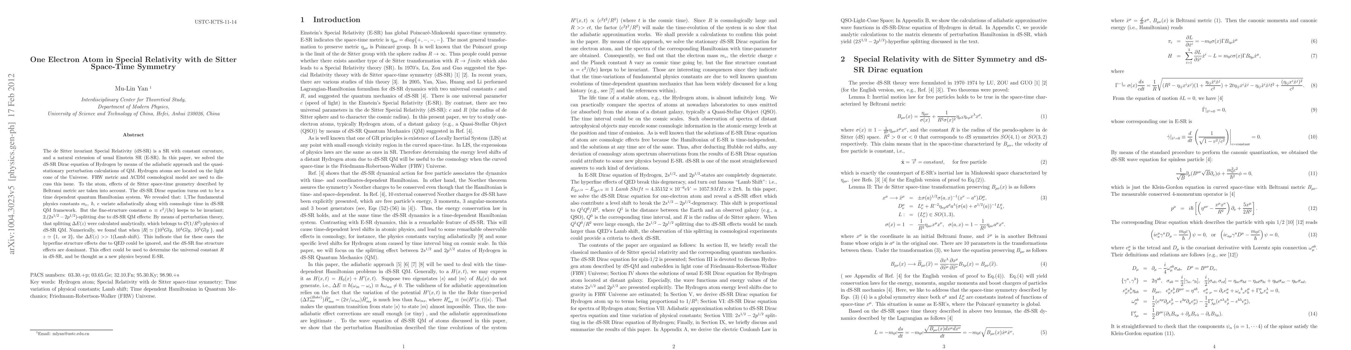 The de Sitter invariant Special Relativity (dS-SR) is a SR with constant curvature, and a natural extension of usual Einstein SR (E-SR). In this paper, we solved the dS-SR Dirac equation of Hydrogen by means of the adiabatic approach and the quasi-stationary perturbation calculations of QM. Hydrogen atoms are located on the light cone of the Universe. FRW metric and $\Lambda$CDM cosmological model are used to discuss this issue. To the atom, effects of de Sitter space-time geometry described by Beltrami metric are taken into account. The dS-SR Dirac equation turns out to be a time dependent quantum Hamiltonian system. We revealed that: 1,The fundamental physics constants $m_e,\;\hbar,\;e$ variate adiabatically along with cosmologic time in dS-SR QM framework. But the fine-structure constant $\alpha\equiv e^2/(\hbar c)$ keeps to be invariant; 2,$(2s^{1/2}-2p^{1/2})$-splitting due to dS-SR QM effects: By means of perturbation theory, that splitting $\Delta E(z)$ were calculated analytically, which belongs to $\mathcal{O}(1/R^2)$-physics of dS-SR QM. Numerically, we found that when $|R|\simeq \{10^3 Gly,\;10^4 Gly,\;10^5 Gly\;\}$, and $z\simeq \{1,\;{\rm or}\;2\}$, the $\Delta E(z)>> 1{\rm (Lamb\; shift)}$. This indicate that for these cases the hyperfine structure effects due to QED could be ignored, and the dS-SR fine structure effects are dominant. This effect could be used to determine the universal constant $R$ in dS-SR, and be thought as a new physics beyond E-SR.
