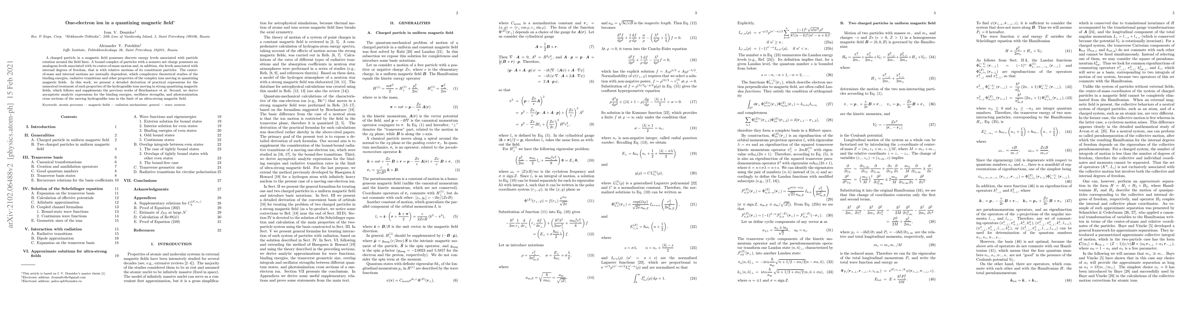 A charged particle in a magnetic field possesses discrete energy levels associated with particle rotation around the field lines. A bound complex of particles with a nonzero net charge possesses an analogous levels associated with its center-of-mass motion and, in addition, the levels associated with internal degrees of freedom, that is with relative motions of its constituent particles. The center-of-mass and internal motions are mutually dependent, which complicates theoretical studies of the binding energies, radiative transitions and other properties of the complex ions moving in quantizing magnetic fields. In this work, we present a detailed derivation of practical expressions for the numerical treatment of such properties of the hydrogenlike ions moving in strong quantizing magnetic fields, which follows and supplements the previous works of Bezchastnov et al. Second, we derive asymptotic analytic expressions for the binding energies, oscillator strengths, and photoionization cross sections of the moving hydrogenlike ions in the limit of an ultra-strong magnetic field.