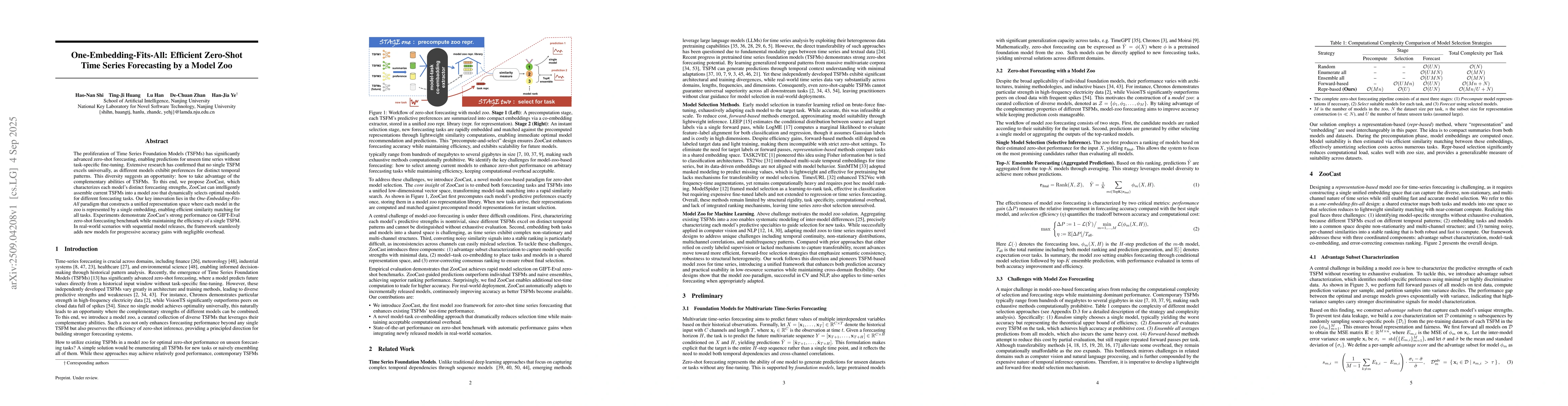 The proliferation of Time Series Foundation Models (TSFMs) has significantly advanced zero-shot forecasting, enabling predictions for unseen time series without task-specific fine-tuning. Extensive research has confirmed that no single TSFM excels universally, as different models exhibit preferences for distinct temporal patterns. This diversity suggests an opportunity: how to take advantage of the complementary abilities of TSFMs. To this end, we propose ZooCast, which characterizes each model's distinct forecasting strengths. ZooCast can intelligently assemble current TSFMs into a model zoo that dynamically selects optimal models for different forecasting tasks. Our key innovation lies in the One-Embedding-Fits-All paradigm that constructs a unified representation space where each model in the zoo is represented by a single embedding, enabling efficient similarity matching for all tasks. Experiments demonstrate ZooCast's strong performance on the GIFT-Eval zero-shot forecasting benchmark while maintaining the efficiency of a single TSFM. In real-world scenarios with sequential model releases, the framework seamlessly adds new models for progressive accuracy gains with negligible overhead.