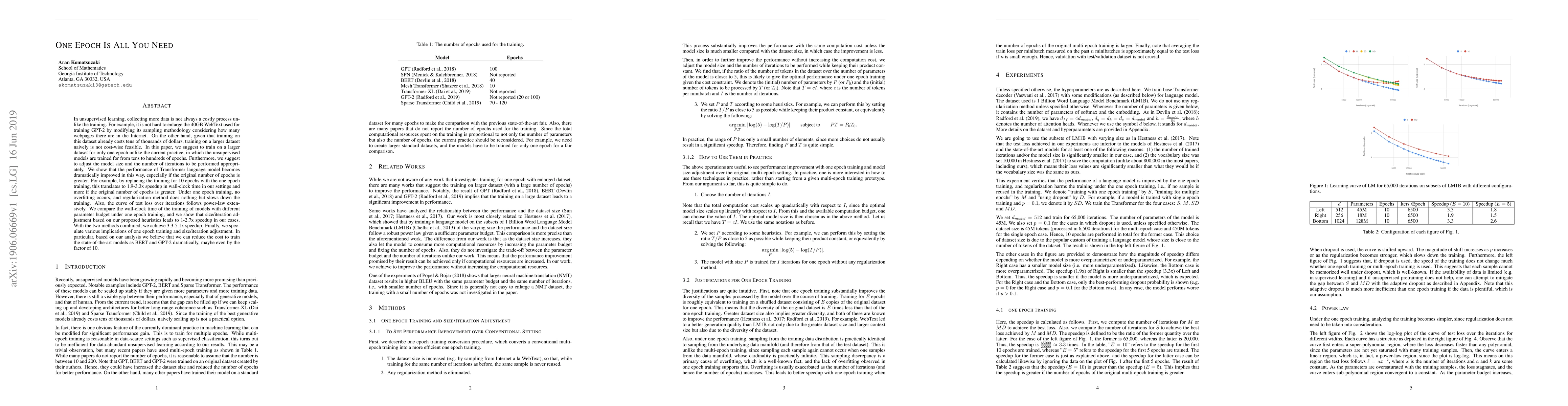 In unsupervised learning, collecting more data is not always a costly process unlike the training. For example, it is not hard to enlarge the 40GB WebText used for training GPT-2 by modifying its sampling methodology considering how many webpages there are in the Internet. On the other hand, given that training on this dataset already costs tens of thousands of dollars, training on a larger dataset naively is not cost-wise feasible. In this paper, we suggest to train on a larger dataset for only one epoch unlike the current practice, in which the unsupervised models are trained for from tens to hundreds of epochs. Furthermore, we suggest to adjust the model size and the number of iterations to be performed appropriately. We show that the performance of Transformer language model becomes dramatically improved in this way, especially if the original number of epochs is greater. For example, by replacing the training for 10 epochs with the one epoch training, this translates to 1.9-3.3x speedup in wall-clock time in our settings and more if the original number of epochs is greater. Under one epoch training, no overfitting occurs, and regularization method does nothing but slows down the training. Also, the curve of test loss over iterations follows power-law extensively. We compare the wall-clock time of the training of models with different parameter budget under one epoch training, and we show that size/iteration adjustment based on our proposed heuristics leads to 1-2.7x speedup in our cases. With the two methods combined, we achieve 3.3-5.1x speedup. Finally, we speculate various implications of one epoch training and size/iteration adjustment. In particular, based on our analysis we believe that we can reduce the cost to train the state-of-the-art models as BERT and GPT-2 dramatically, maybe even by the factor of 10.