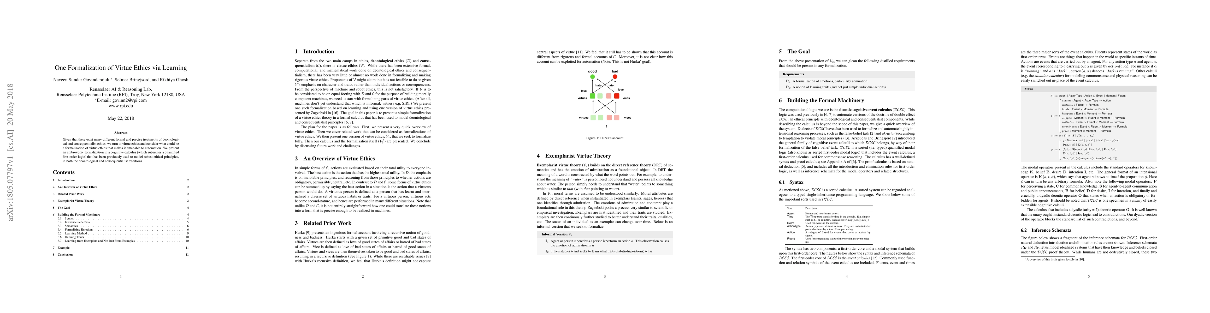 Given that there exist many different formal and precise treatments of deontologi- cal and consequentialist ethics, we turn to virtue ethics and consider what could be a formalization of virtue ethics that makes it amenable to automation. We present an embroyonic formalization in a cognitive calculus (which subsumes a quantified first-order logic) that has been previously used to model robust ethical principles, in both the deontological and consequentialist traditions.