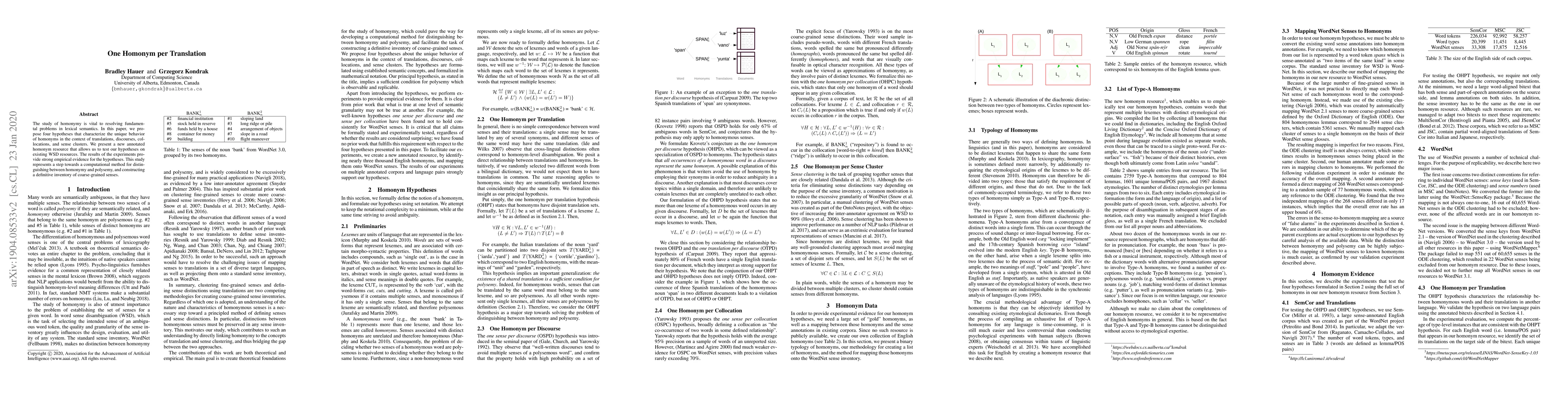 This paper proposes four hypotheses about the unique behavior of homonyms in translations, discourses, collocations, and sense clusters, and introduces a new annotated homonym resource to test these hypotheses, finding strong empirical support for the proposed ideas. The study aims to develop a computational method for distinguishing homonymy from polysemy.