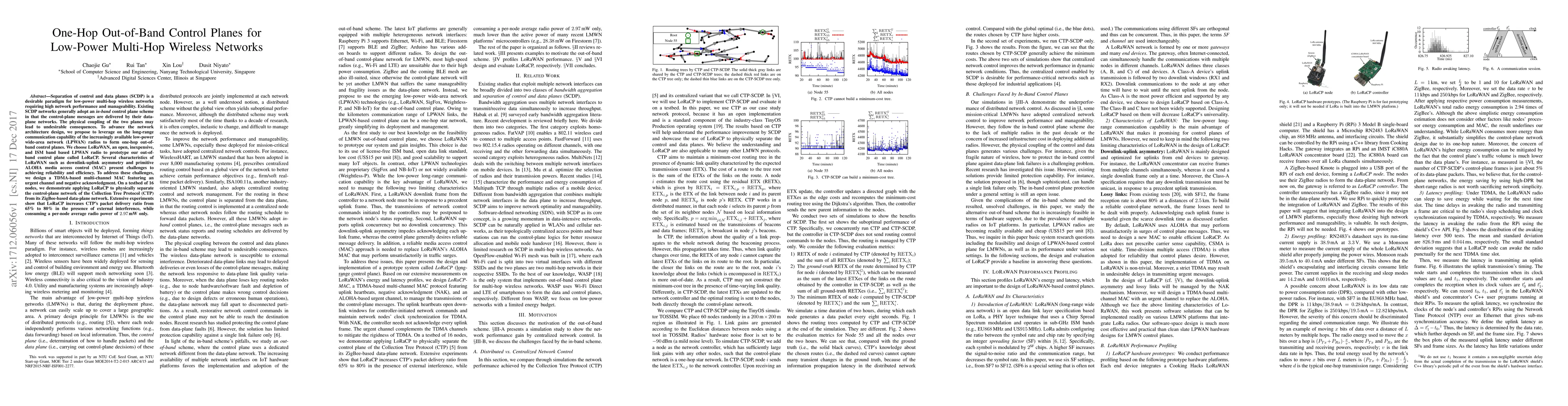 This paper proposes a one-hop out-of-band control plane using LoRaWAN for low-power multi-hop wireless networks to separate control and data planes, enhancing performance and manageability. The designed TDMA-based multi-channel MAC protocol addresses LoRaWAN's challenges, improving the Collection Tree Protocol's packet delivery ratio by 15% under interference while maintaining low power consumption.