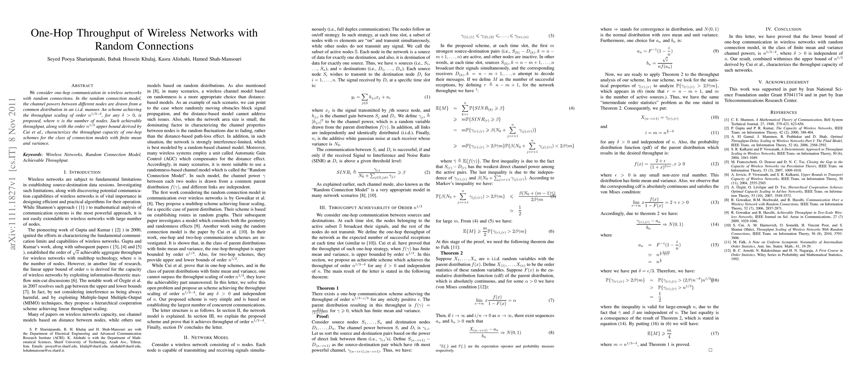 This paper proposes a scheme for one-hop communication in wireless networks with random connections, achieving a throughput scaling of $n^{1/3-\delta}$ for any $\delta>0$. This result aligns with the upper bound of $n^{1/3}$ derived by Cui et al., thus characterizing the throughput capacity for such networks.