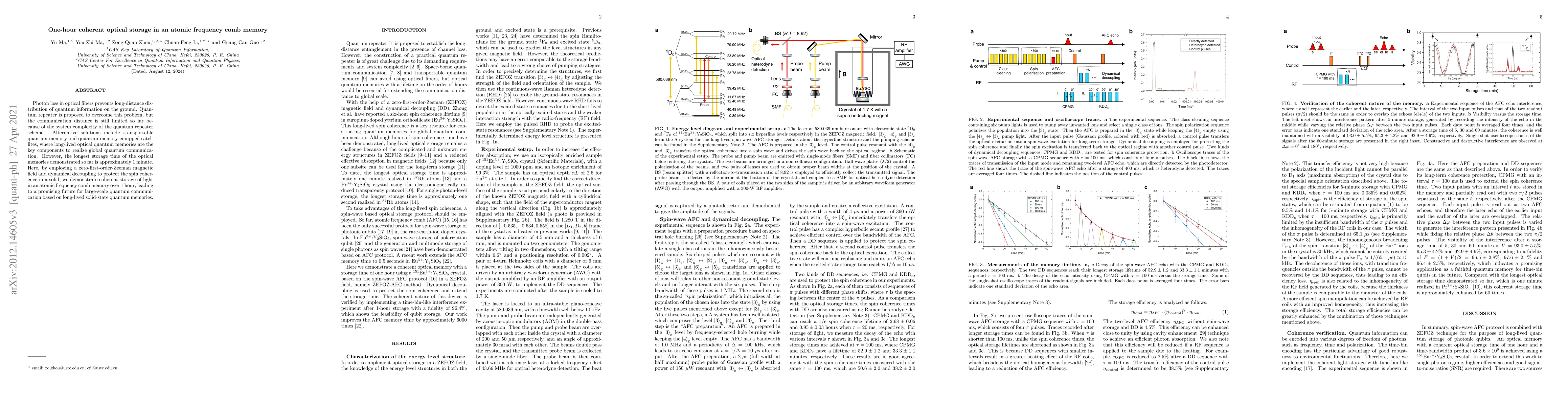 This paper demonstrates coherent optical storage for 1 hour using an atomic frequency comb memory, addressing the photon loss issue in optical fibers. This breakthrough, achieved through a zero-first-order-Zeeman magnetic field and dynamical decoupling, holds promise for large-scale quantum communication with long-lived solid-state quantum memories.
