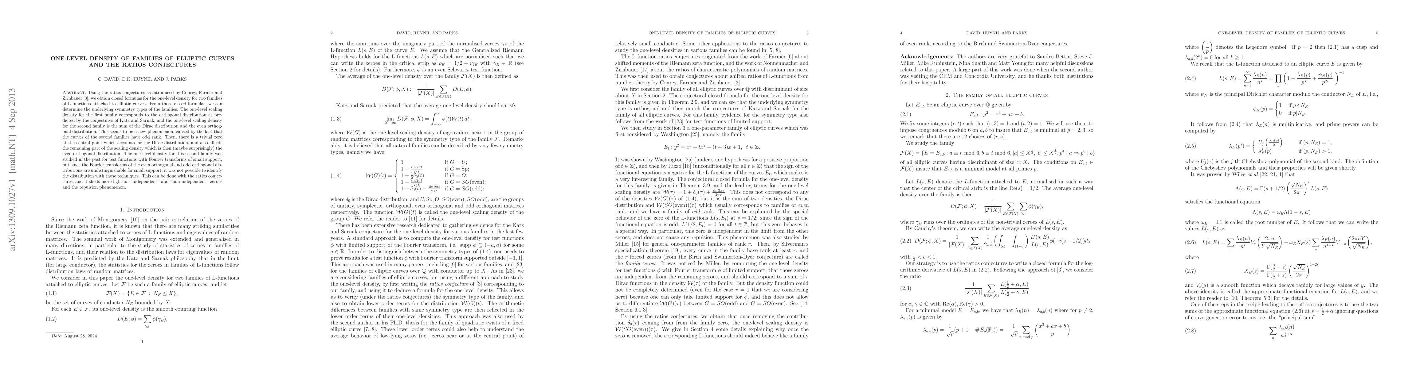This paper uses ratios conjectures to find closed formulas for one-level density of two families of elliptic curves, showing that one family has an orthogonal distribution and the other has a sum of Dirac and even orthogonal distributions.